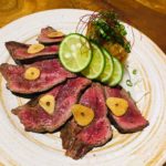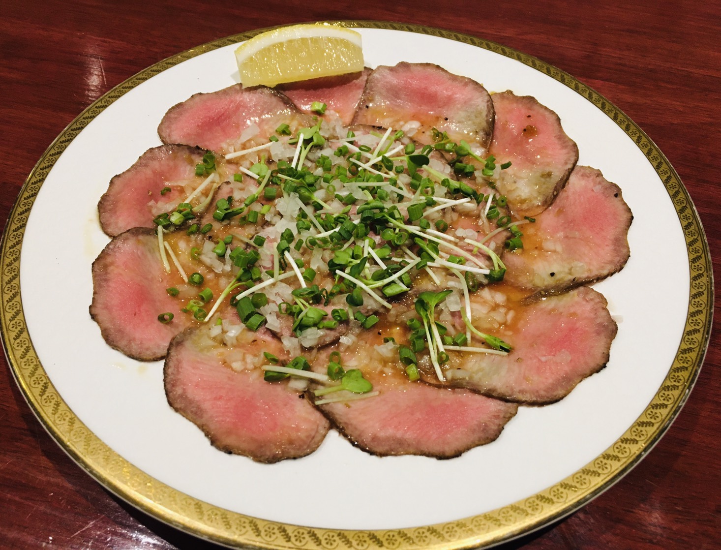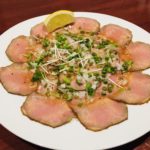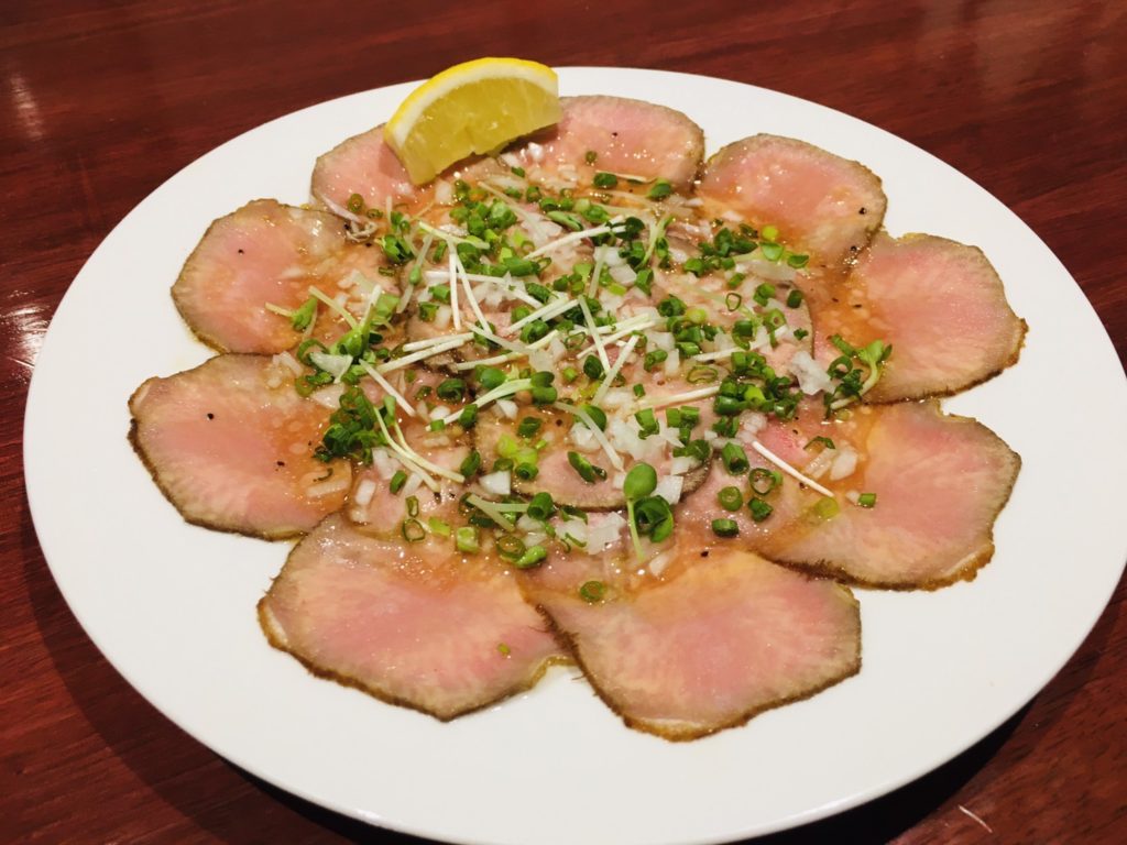 低温調理で旨みを閉じ込めた牛タンカルパッチョ(199B)も必食の一皿。