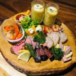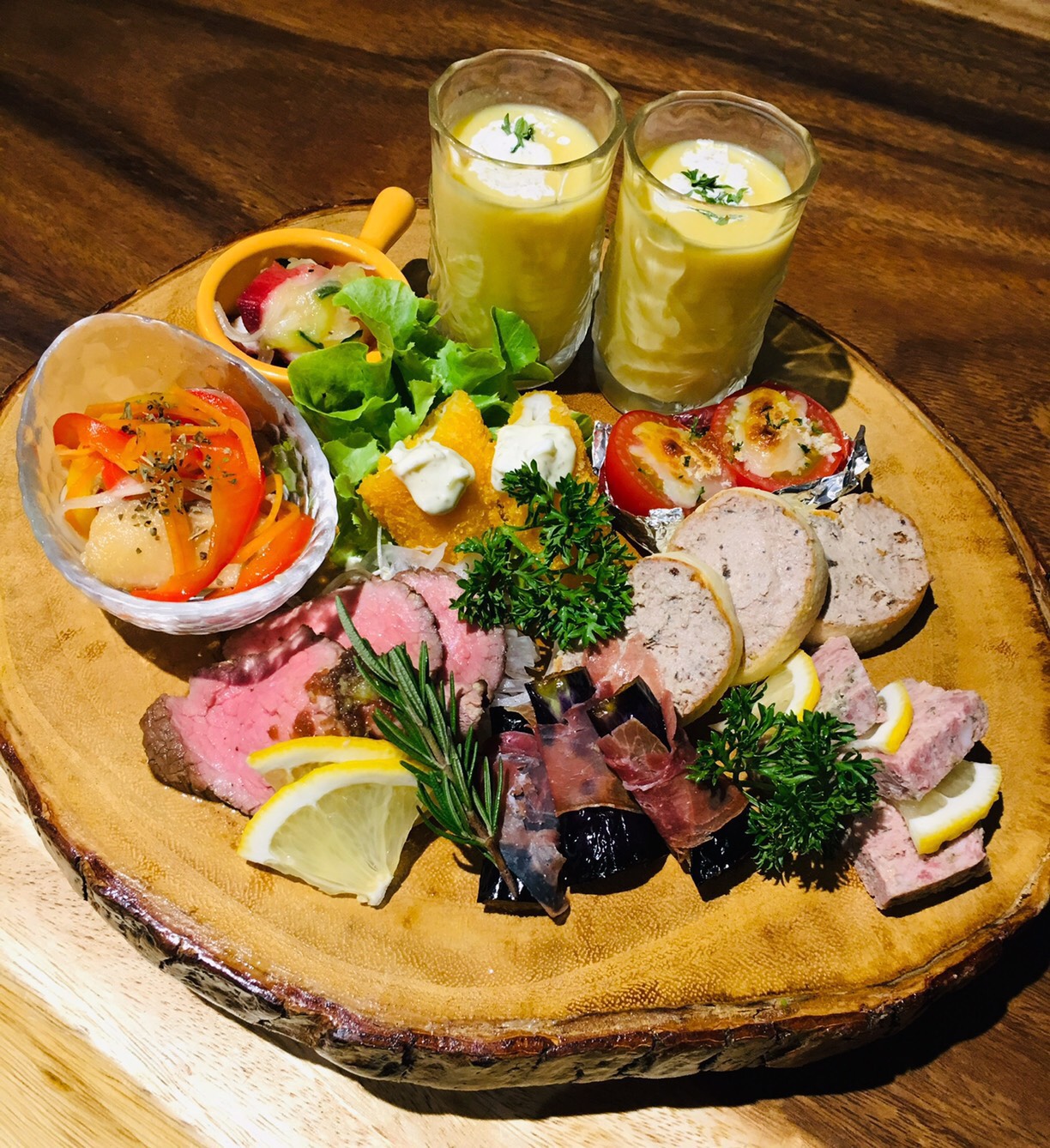 日替わりの前菜を少しずつたくさん、2~4人でシェアできるボリュームもいい。添えられているのは生ビール?と思いきや、コーンなどの食材で仕立てるコールドスープ。写真映えも抜群だ。