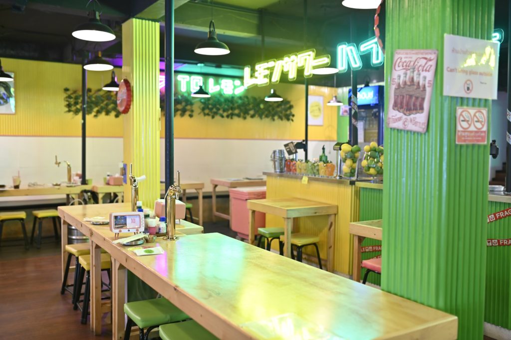 ネオンが灯るソイ26の小路でもひときわ派手な看板が目を惹く「マナオtoれもん」は、テーブルに設置されたサーバーから生ビールが注ぎ放題、レモンサワーやハイボール、ソフトドリンクも飲み放題と、酒好きにとって夢のような空間だ。