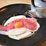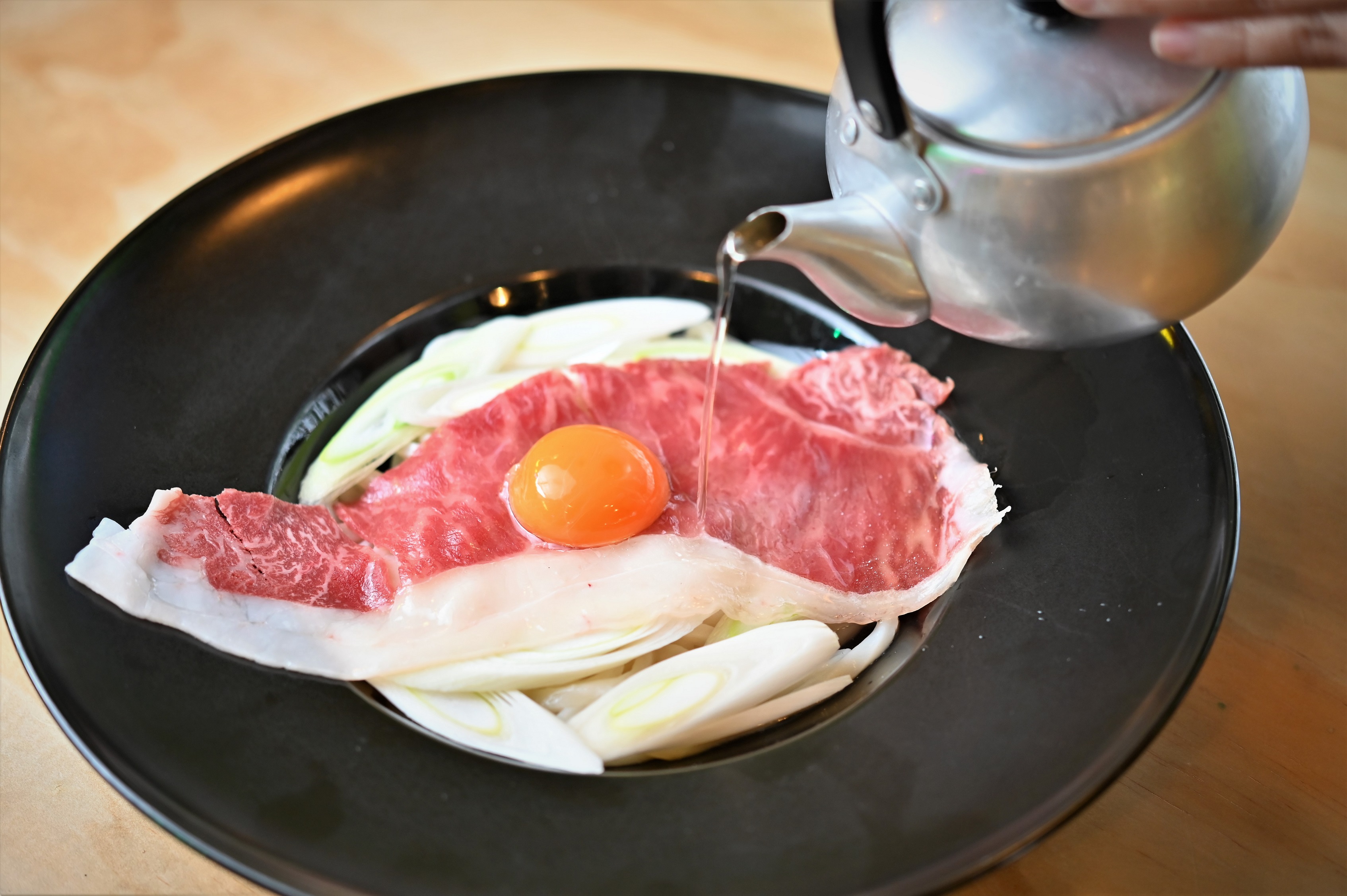 回しかけた出汁でほんのりと肉が色づいていく様子もまた食欲を刺激される。和牛の和風うどん(238B)