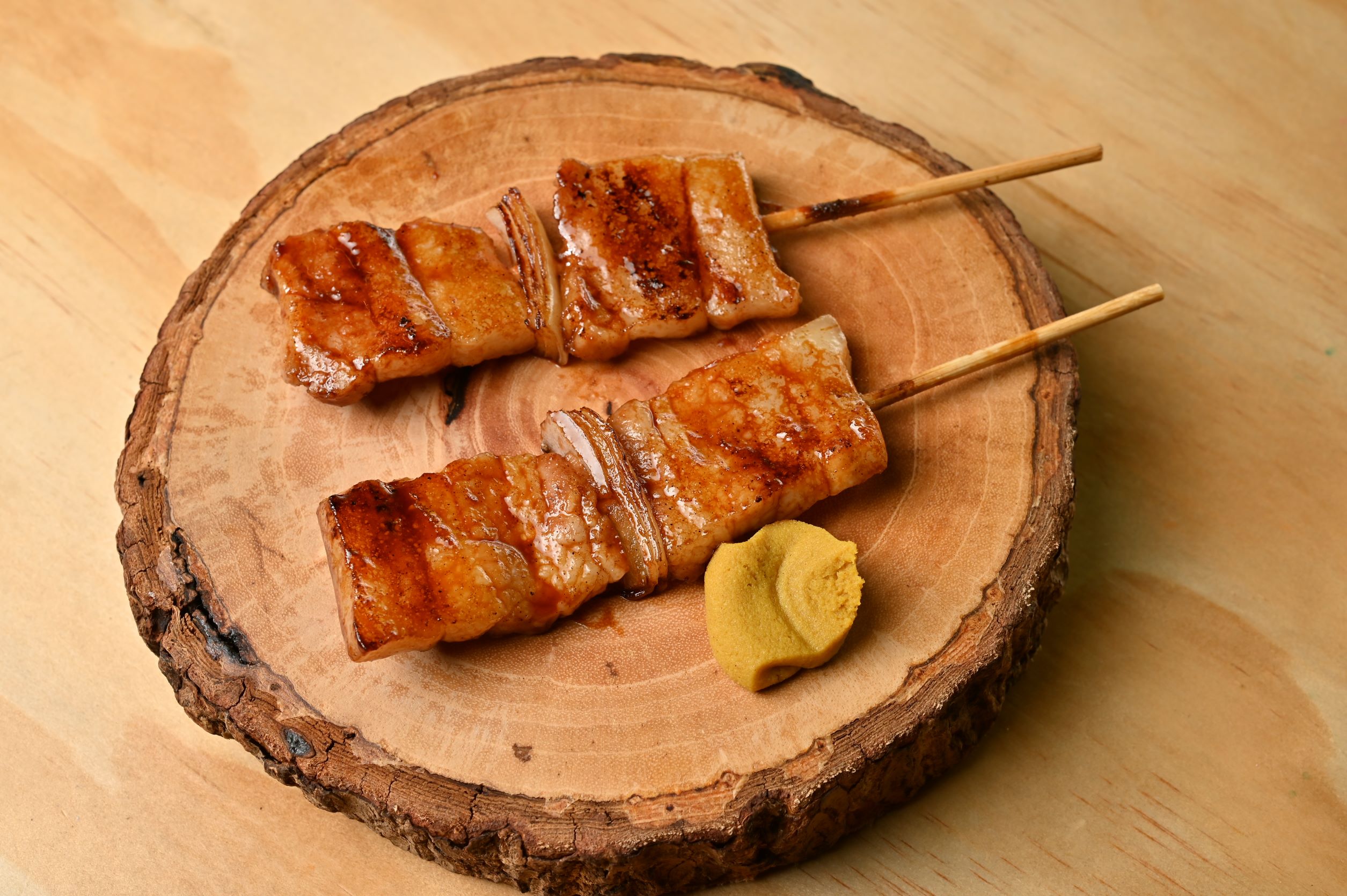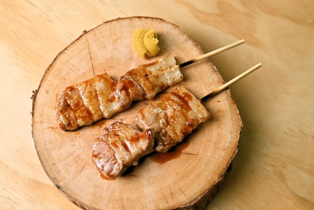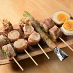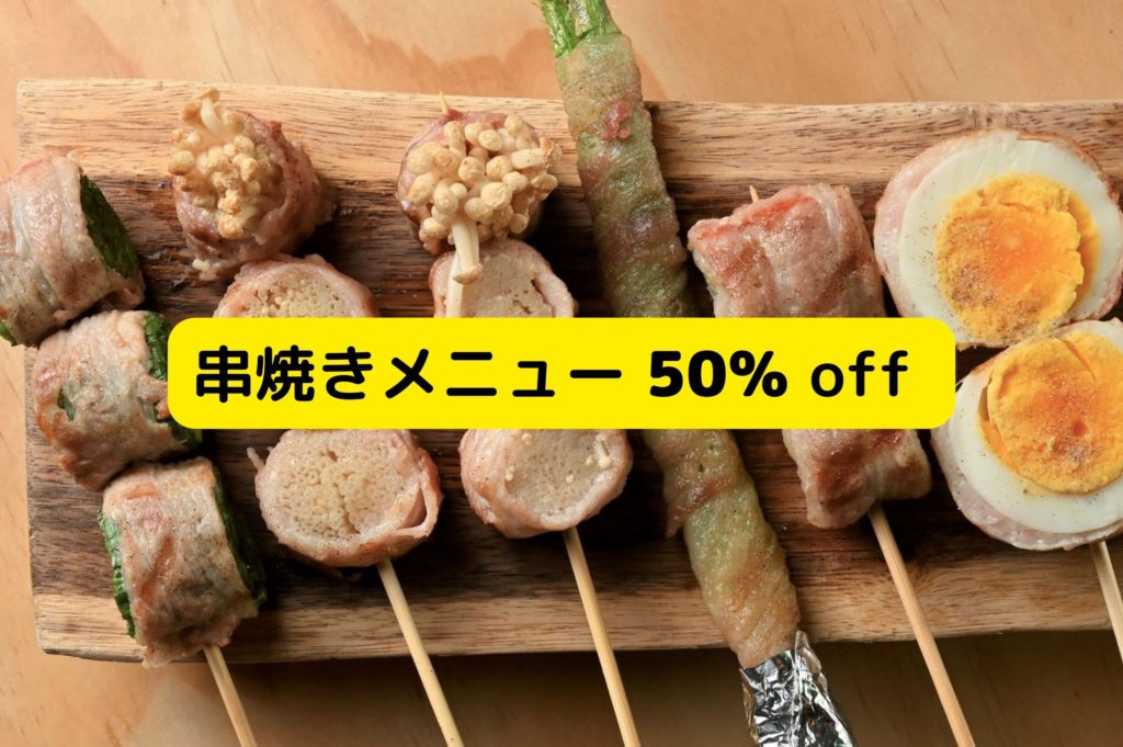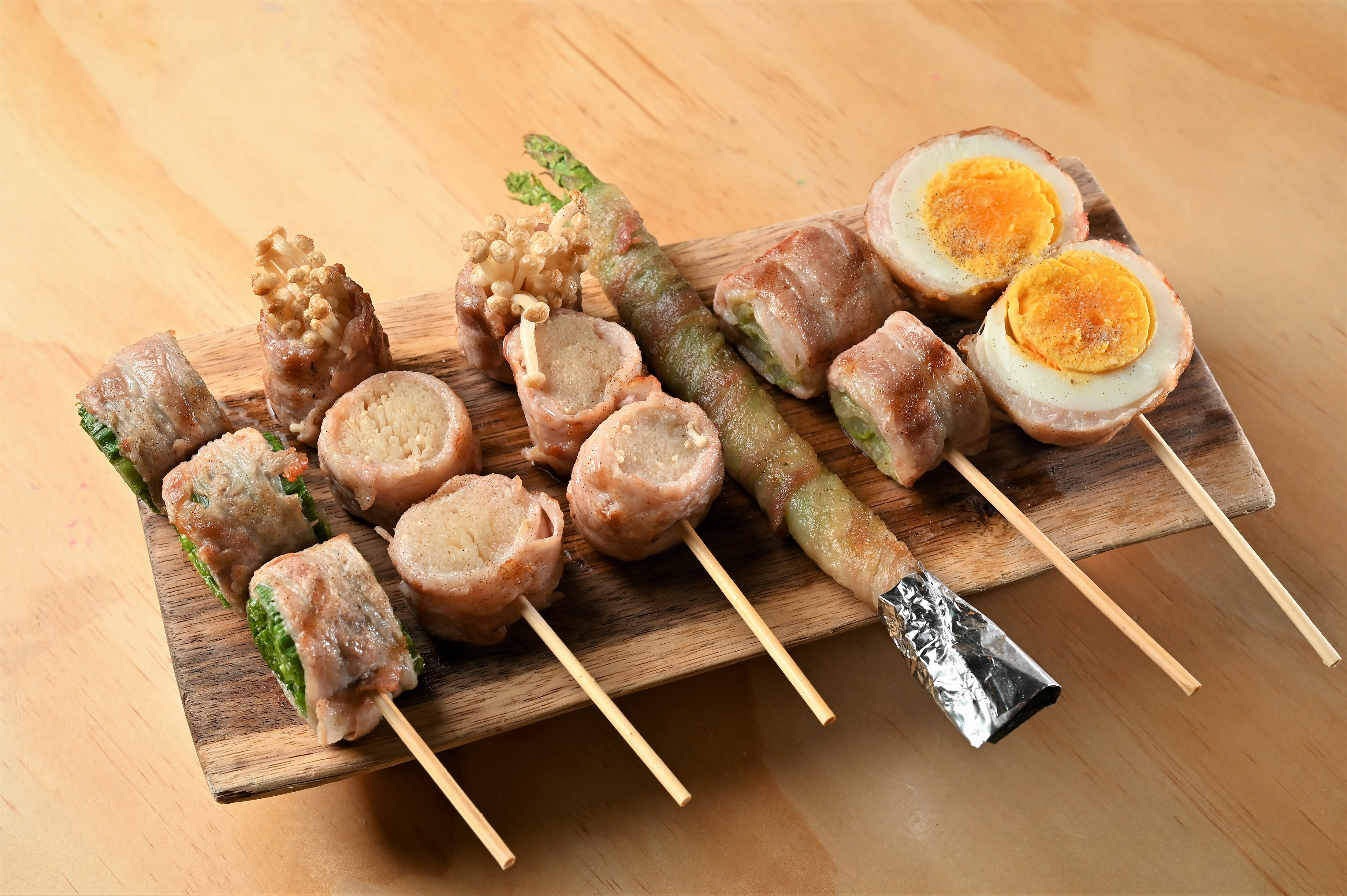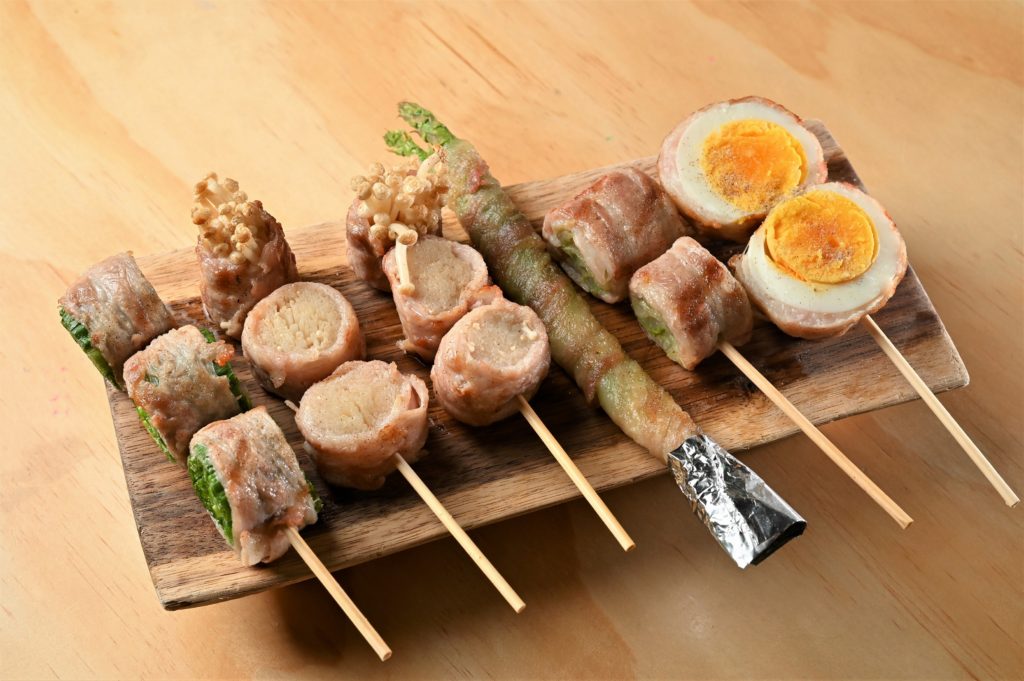 ねぎ豚巻串(78B)、えのき(48B)、アスパラ豚(78B)、レタス豚巻き(48B)、豚エッグ(68B)。実はこれらの串もの全品、オールデイ・オールタイム全品50%OFF(デリバリーも半額!)というプロモーションを実施中