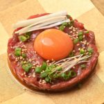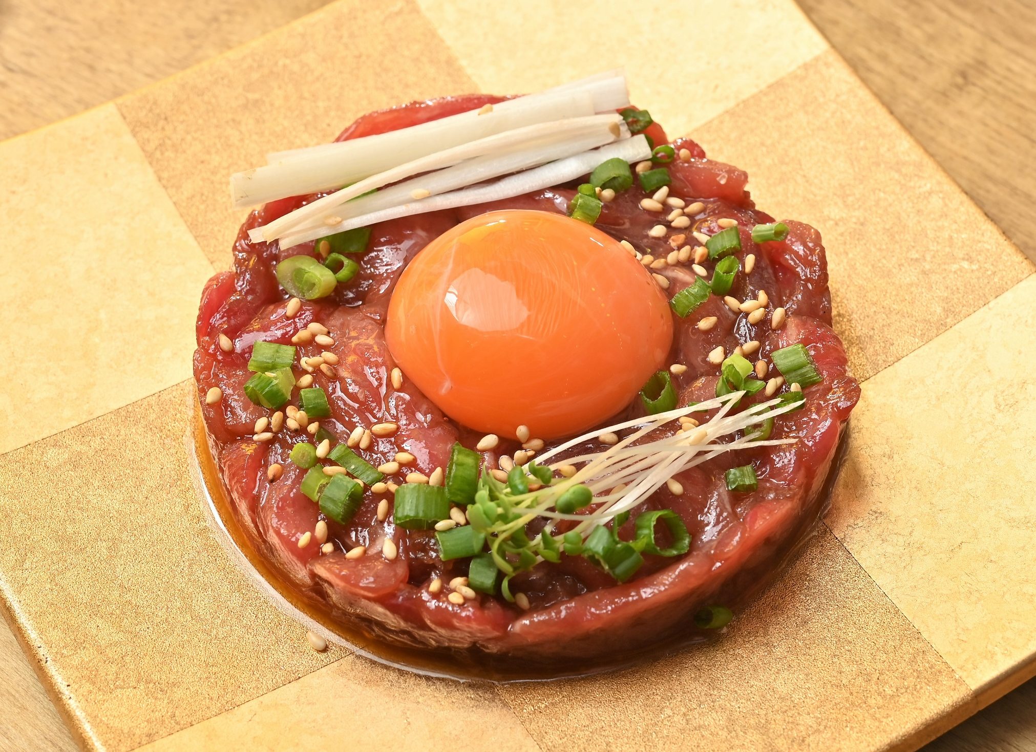 職人仕込みのもみダレがしっかり馴染む定番のたれ牛ユッケ(168B)。粗く刻んだ生肉に濃厚な卵黄が絡み合い、一度食べたら必ずハマる味わいに