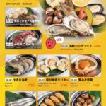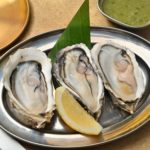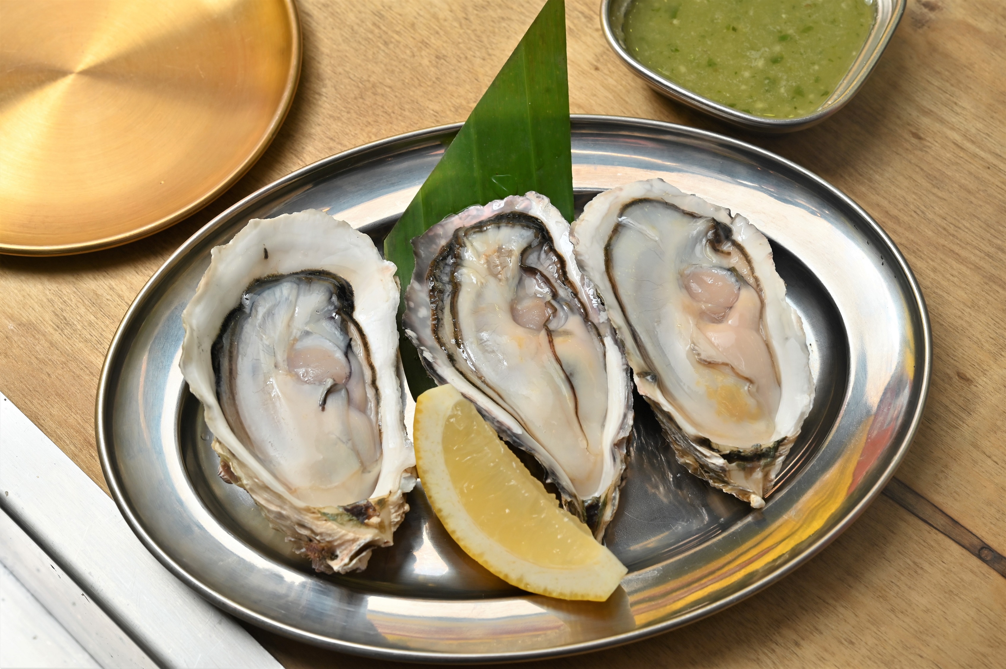大ぶりの牡蠣(120B)は生食もOK。炭火で焼けば牡蠣本来の旨みと香りが際立ち、冷えた生ビールとベストマッチ