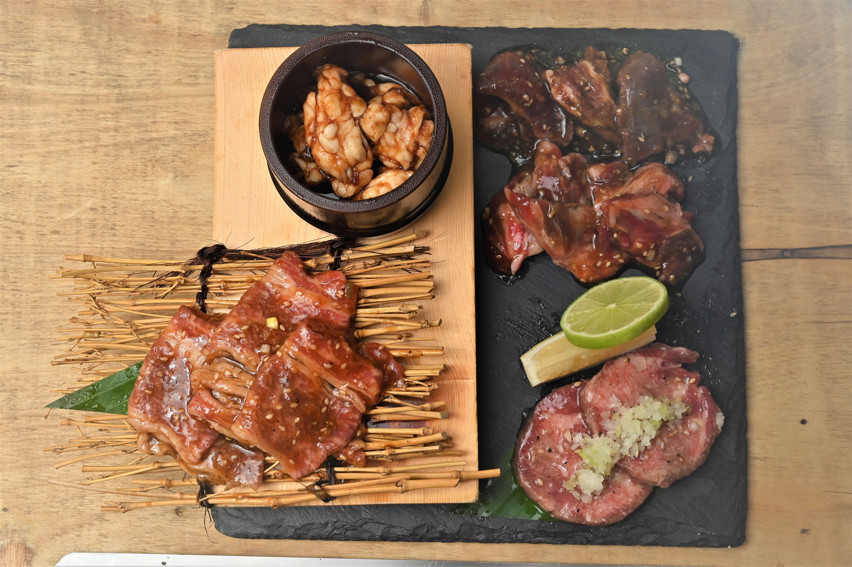 和牛カルビ、牛ハラミ、和牛中落カルビ、牛タン、牛ホルモン牛をゴージャスに盛り合わせた牛焼肉五種盛り(598B)