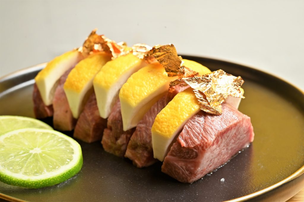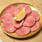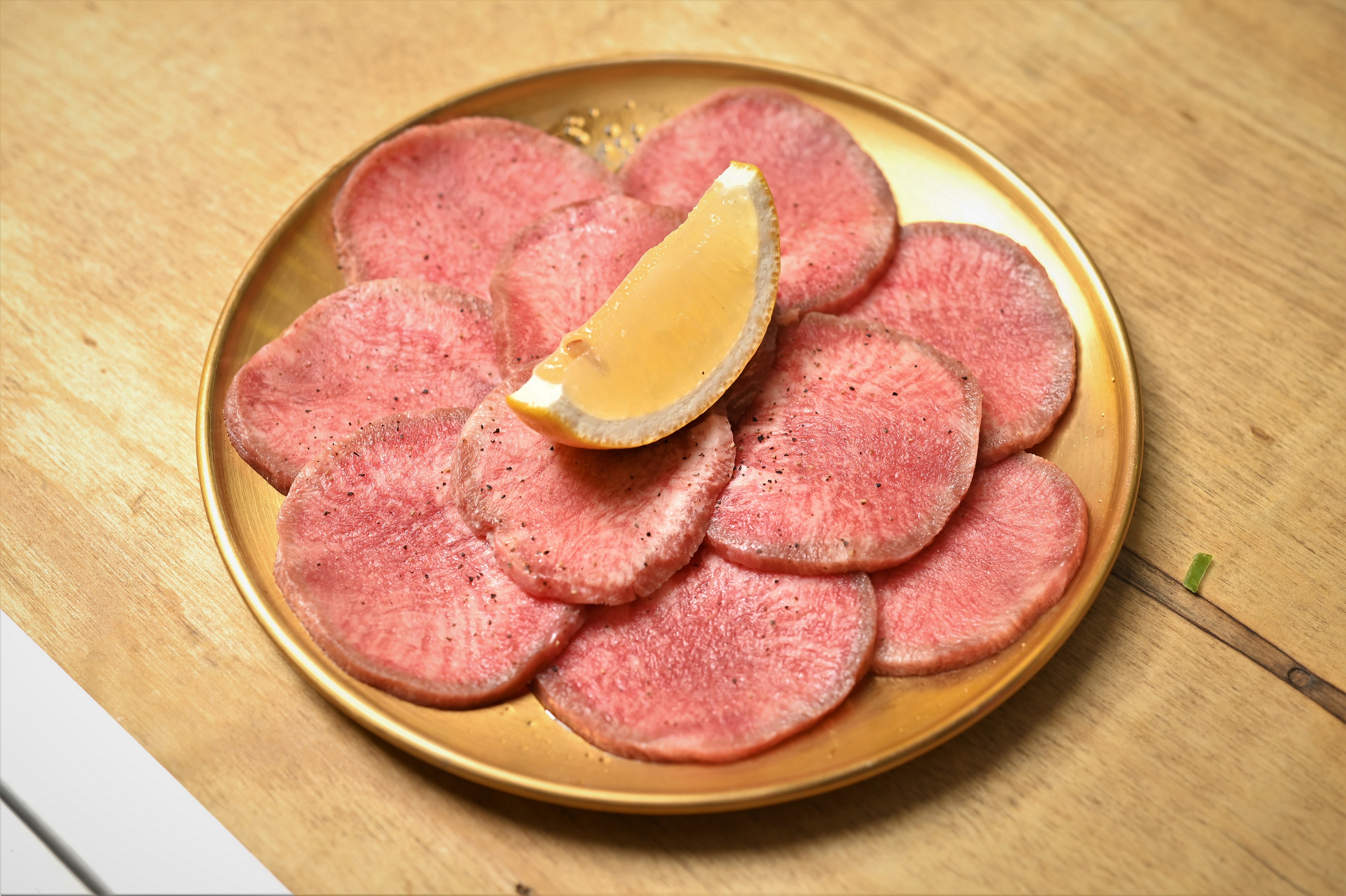 新鮮で脂のりも抜群な厚切り牛タン(248B)は、肉に負けない厚切りレモンが爽やかな深みを添える。散らした金箔もフォトジェニック