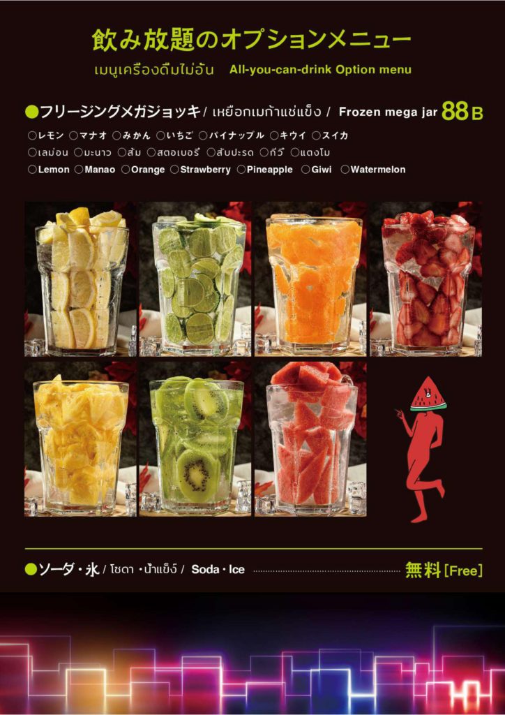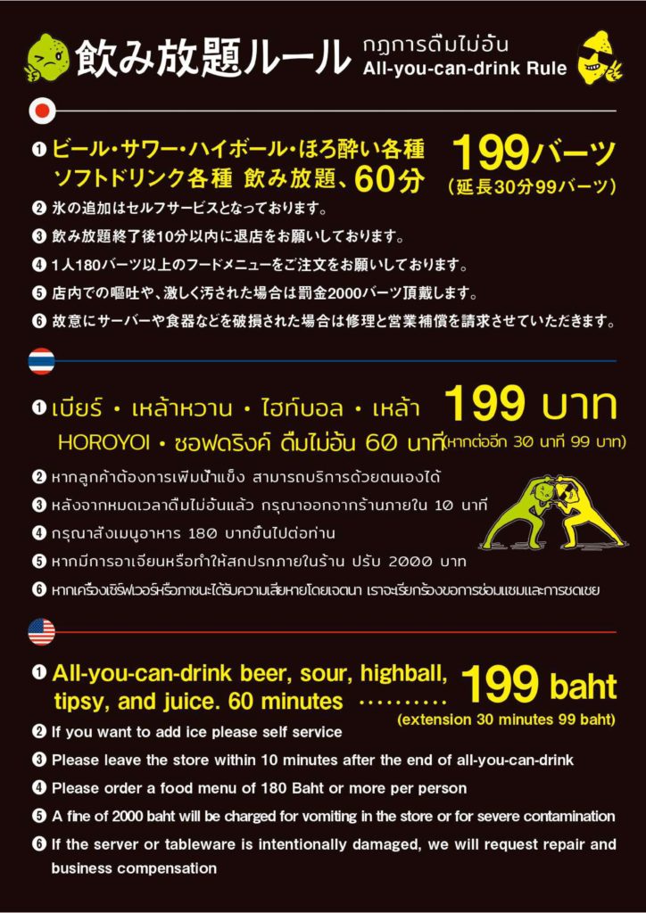 蛇口をひねるとお酒が出てくる、そんな夢のような空間がこちらの「マナオtoれもん」。飲み放題のルールはいたってシンプル。60分飲み放題199B、延長30分毎に99Bが加算される。今日はとことん飲むぞと決めたなら2時間379Bのパックを利用するもよし、3時間目から先は1時間毎に99Bと、延長するに従ってどんどんお得になっていく仕組みがウレシい。