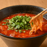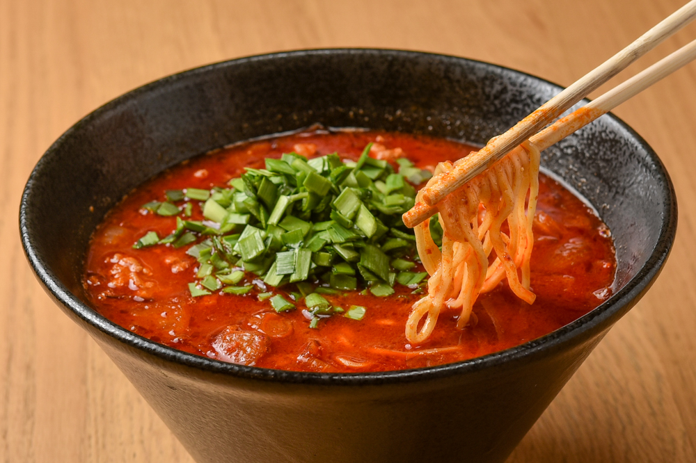 表面を覆う真っ赤なインパクトとは裏腹に、辛さの中に奥深いコクと素材の甘みを感じるスープ。中太麺によく絡み、すするごとにかぐわしいスパイスの香りが食欲を刺激する。
