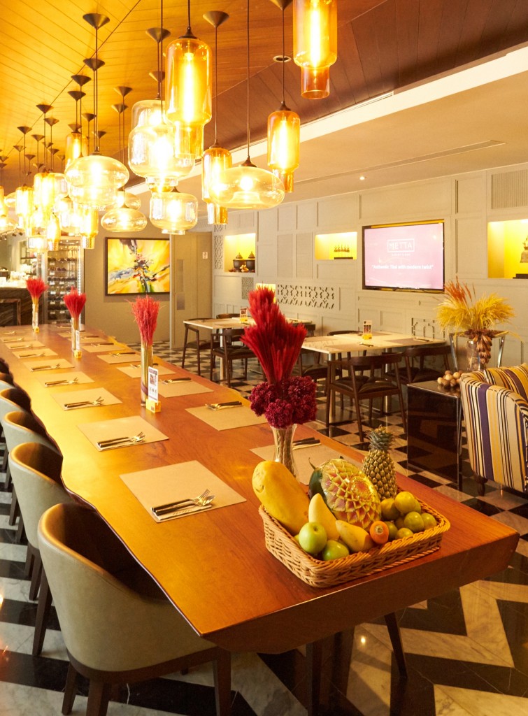 パッと目をひくロングテーブルは、“大切な人と料理をシェアして楽しんで”という想いの象徴。サンスクリット語で慈愛を意味する「メッタ」のキッチンを司るのは、国内外の一流ホテルで腕を磨いたベテランシェフ、サラウットさん。MSG不使用、良質な食材のみを使って伝統にモダンなエッセンスを加えた独創的な料理で客を喜ばせてくれる。手頃なランチ(199B)もビジネスマンに好評。