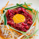 ソースはたまねぎとニンニクを効かせた醤油ベースのオリジナルソースと、深い味わいのデミグラスソースの2種類を用意。
