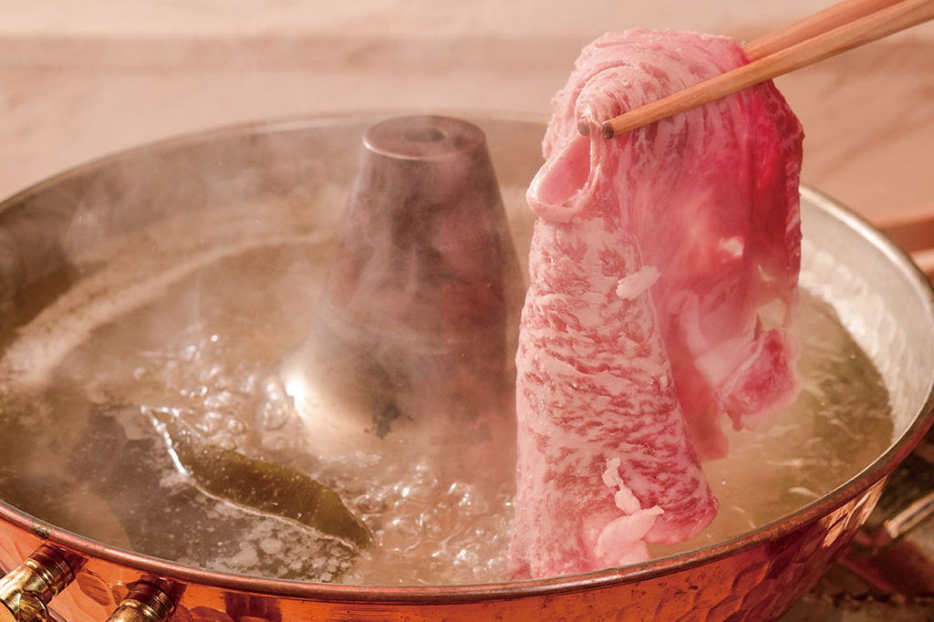 しゃぶしゃぶコース(1,580B)は、脂の質がよくもたれない、最高グレードの和牛の真髄を心ゆくまで楽しめる
