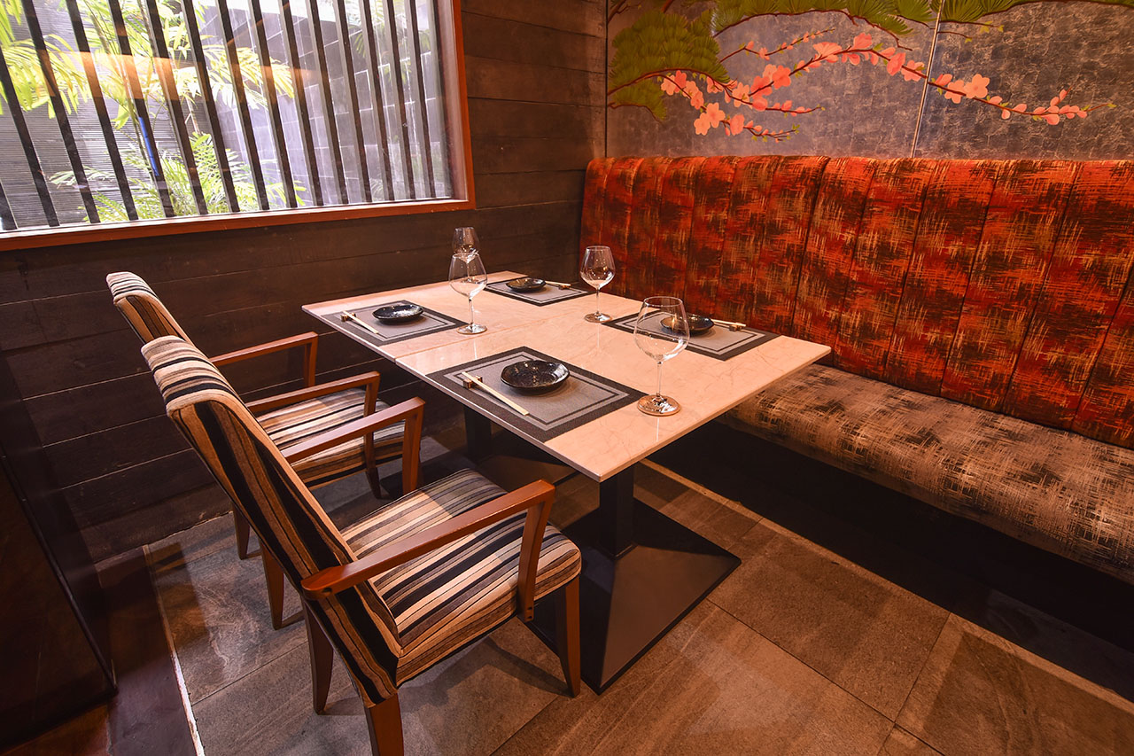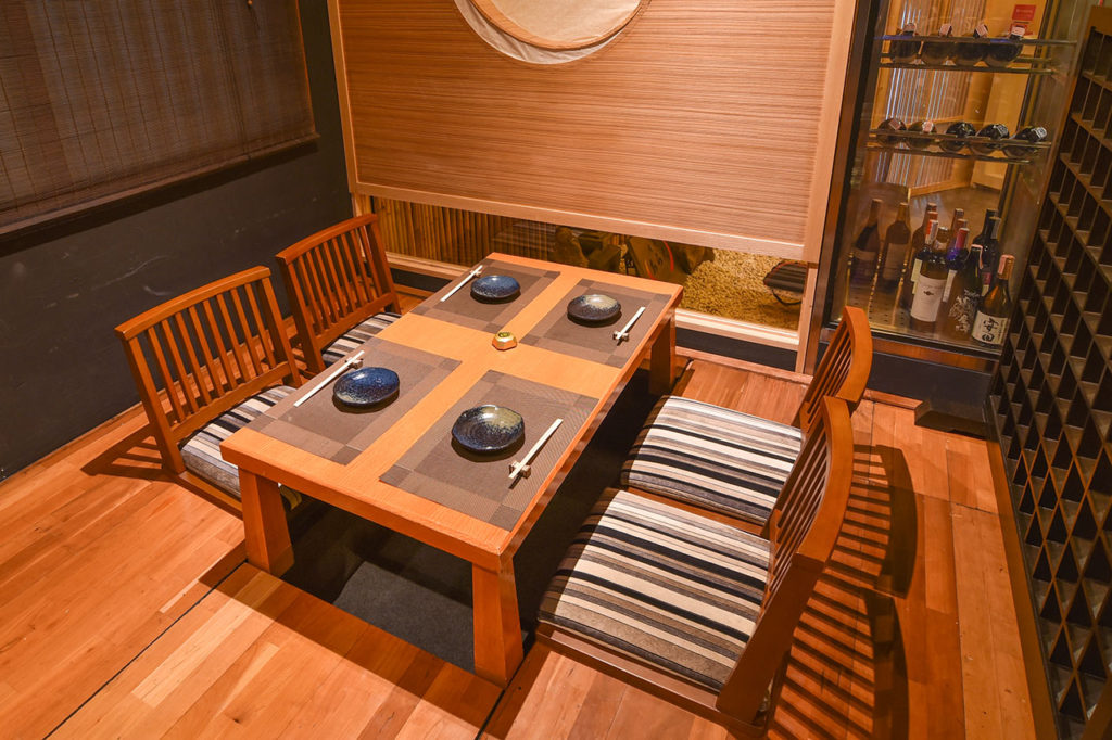 重厚さとモダンさが同居した座敷席。選び抜かれた銘酒とともに過ごしたい