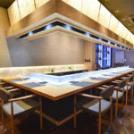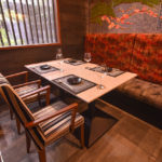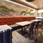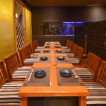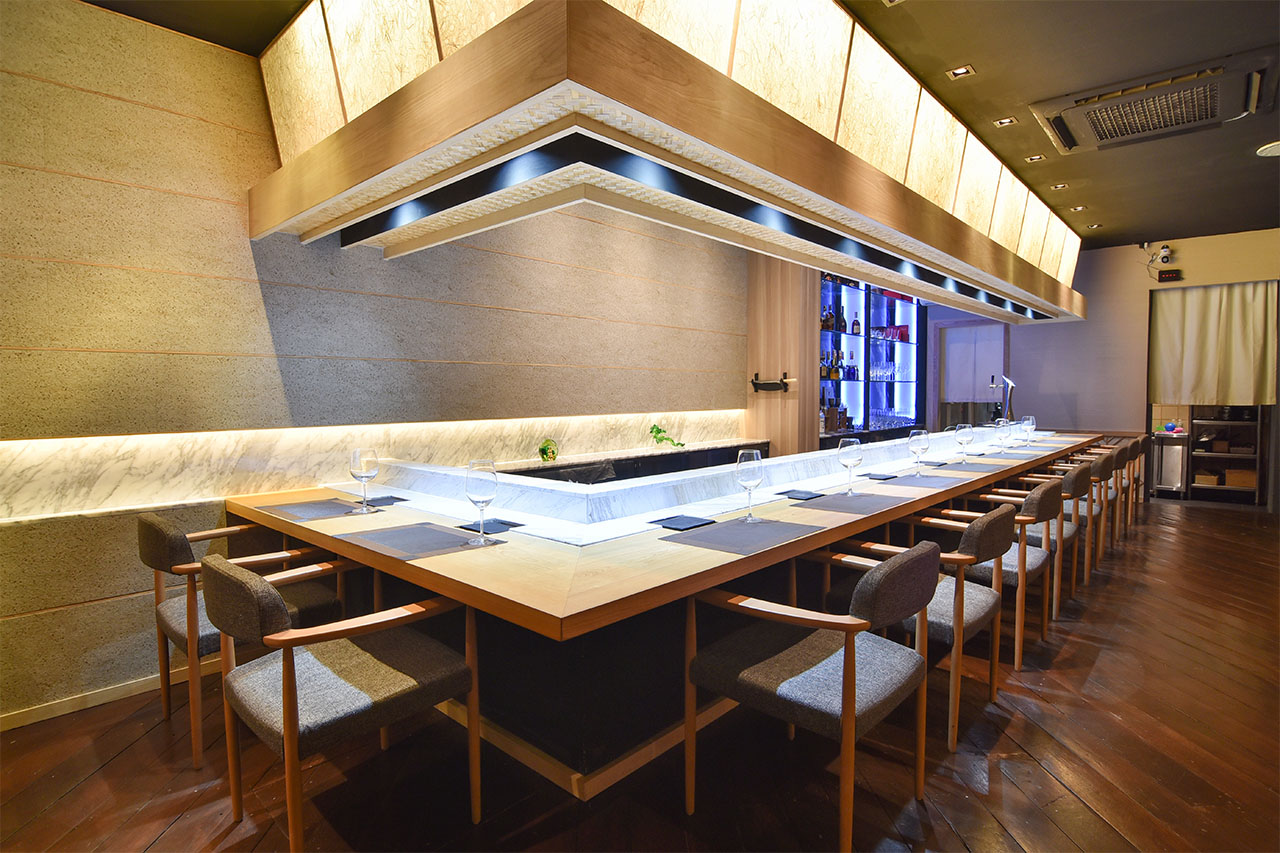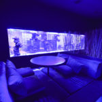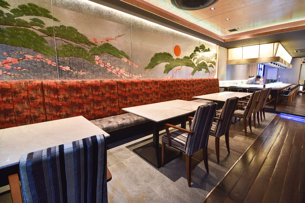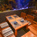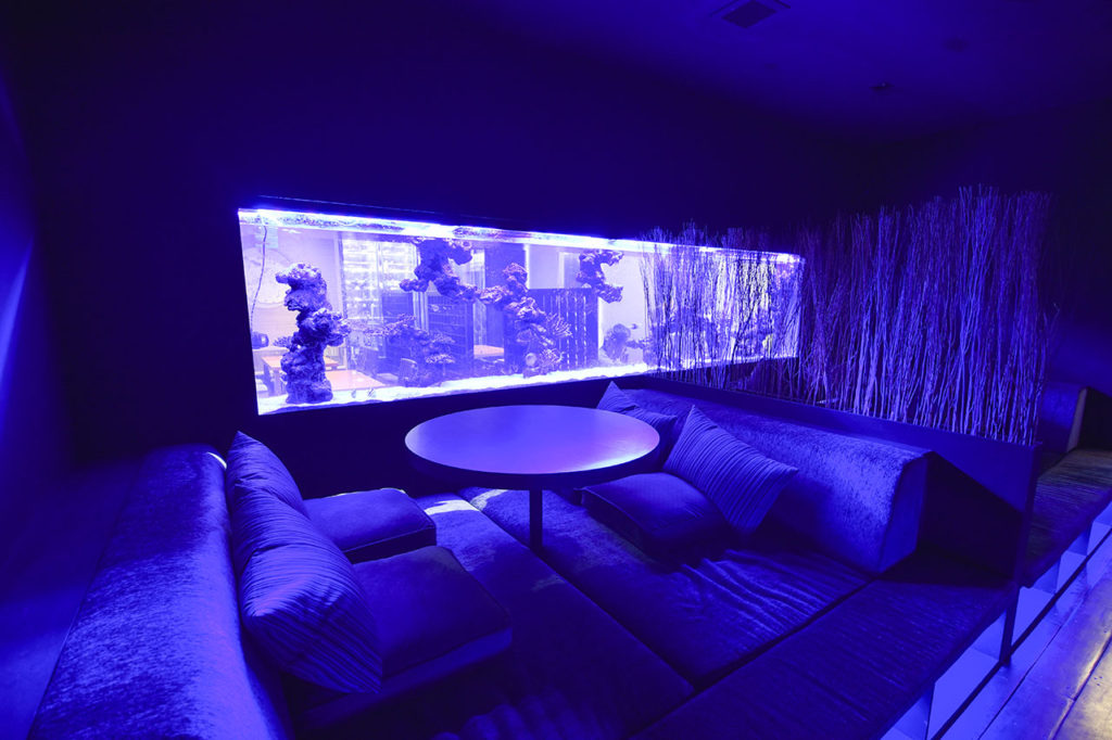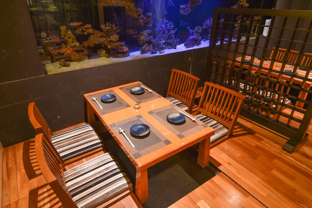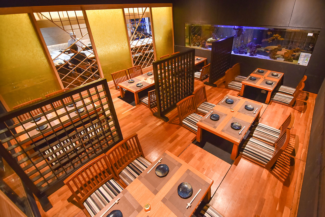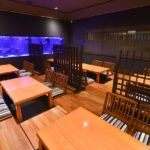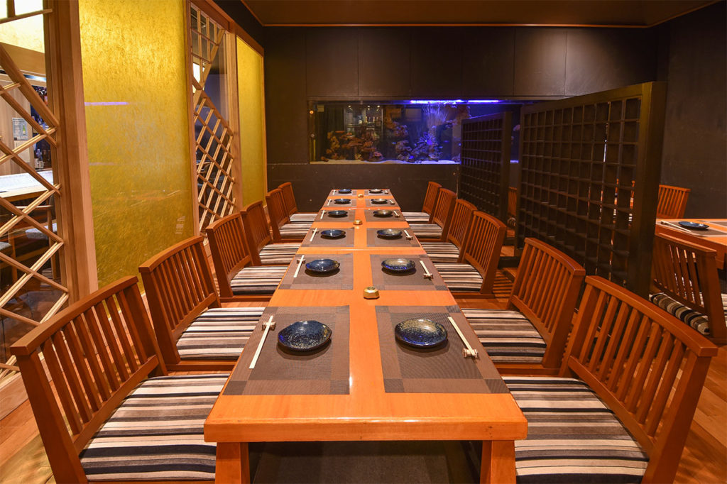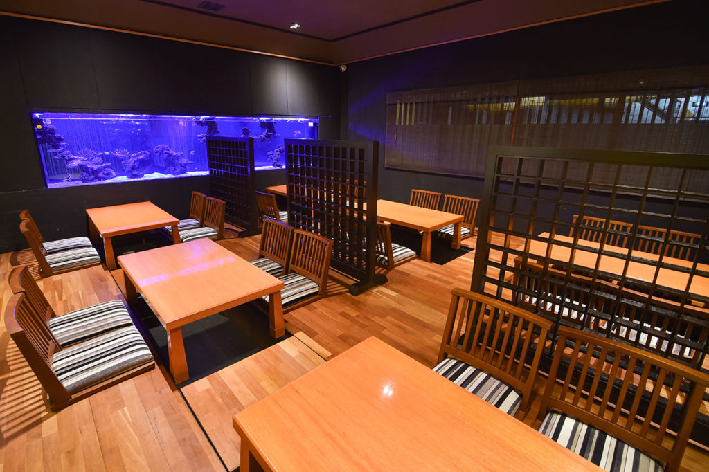 カウンター席のほか、銀屏風絵がお見事なテーブル席、掘ごたつ席、寝転がれるほど大きいソファを設えたリクライニング席と、シートも多彩。カウンターで食事してから、ソファに移動しグラスを傾ける、なんて使い方も。掘ごたつ席を擁す部屋は4~26名と幅広い人数に対応し、一部喫煙も可。全長4メートルの巨大アクアリウムに泳ぐ海水熱帯魚を眺めていると、ゆったりした気分で非日常に浸ることができる。