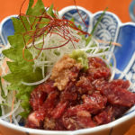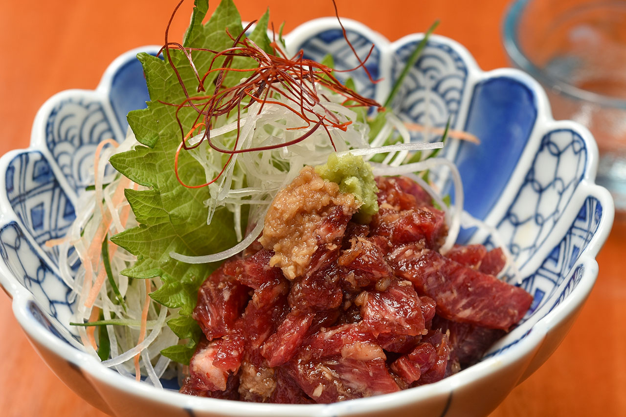 肉亭ユッケ(300B)。肉の旨みはさることながら、その良質な香りと滑らかな口当たりも堪能したい