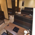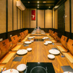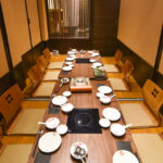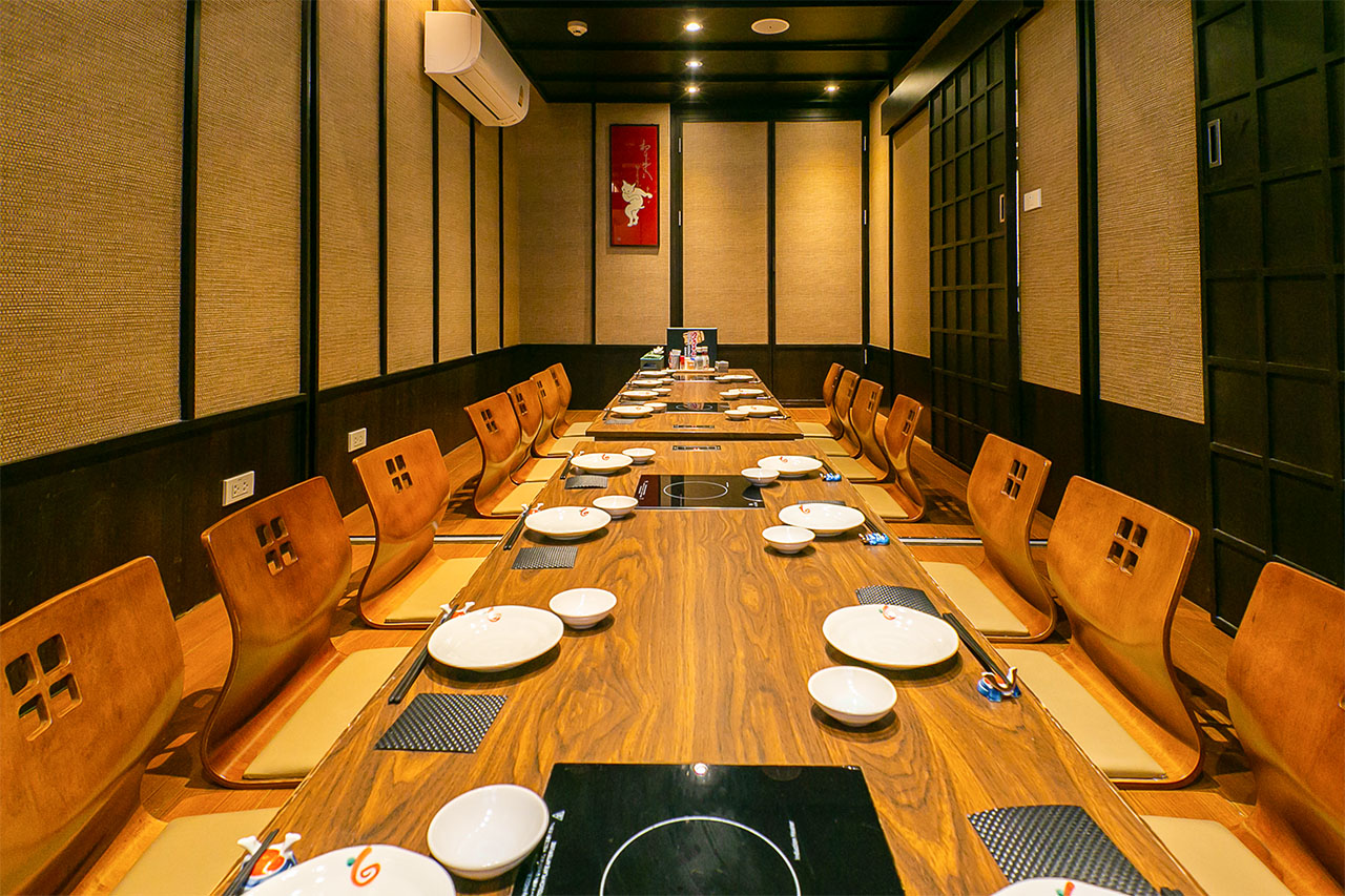 店内に一歩入るとスクンビット通りの喧噪から一転。格子で区切られたテーブル席と落ち着いた空間がお出迎え。その奥には8部屋の個室を設け、2~16名で利用可能。