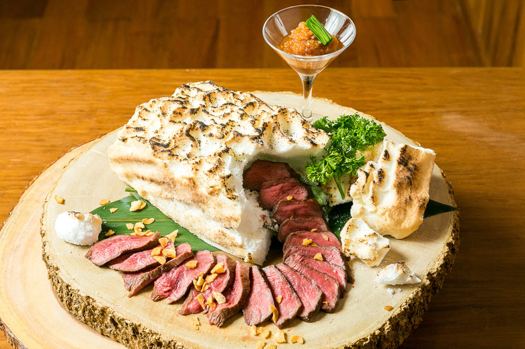 炙り帆立の雲丹海苔巻き(400B)・瞬間スモーク(280B~)塩釜ロースとビーフ(850B)パルメジャーノレッジャーノ釜のカルボナーラ(380B)。食材へのこだわりはもちろん、提供方法にまでこだわり、あらゆる食文化をクロスオーバーした、五感に訴えかける珠玉のひと皿を届けている。
