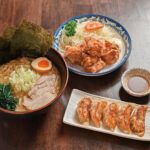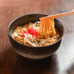 お得に飲むなら、平日ハッピーアワー(13時~19時)を狙って行きたい。アサヒ生ビール一杯49B、ハイボール一杯39B、しかも何杯飲んでもOKという懐深さ。昼から深夜まで通しで営業しているので、麺、酒、つまみに満足できる「呑めるラーメン屋」として覚えておいて損はない。お腹いっぱいでも最後にスルリと食べれてしまうのがラーメンの不思議。さて、酒の〆の一杯はどれにしようか? メニューいっぱいのご当地ラーメンを眺めながら、そんな風に迷うのもまた楽しい。