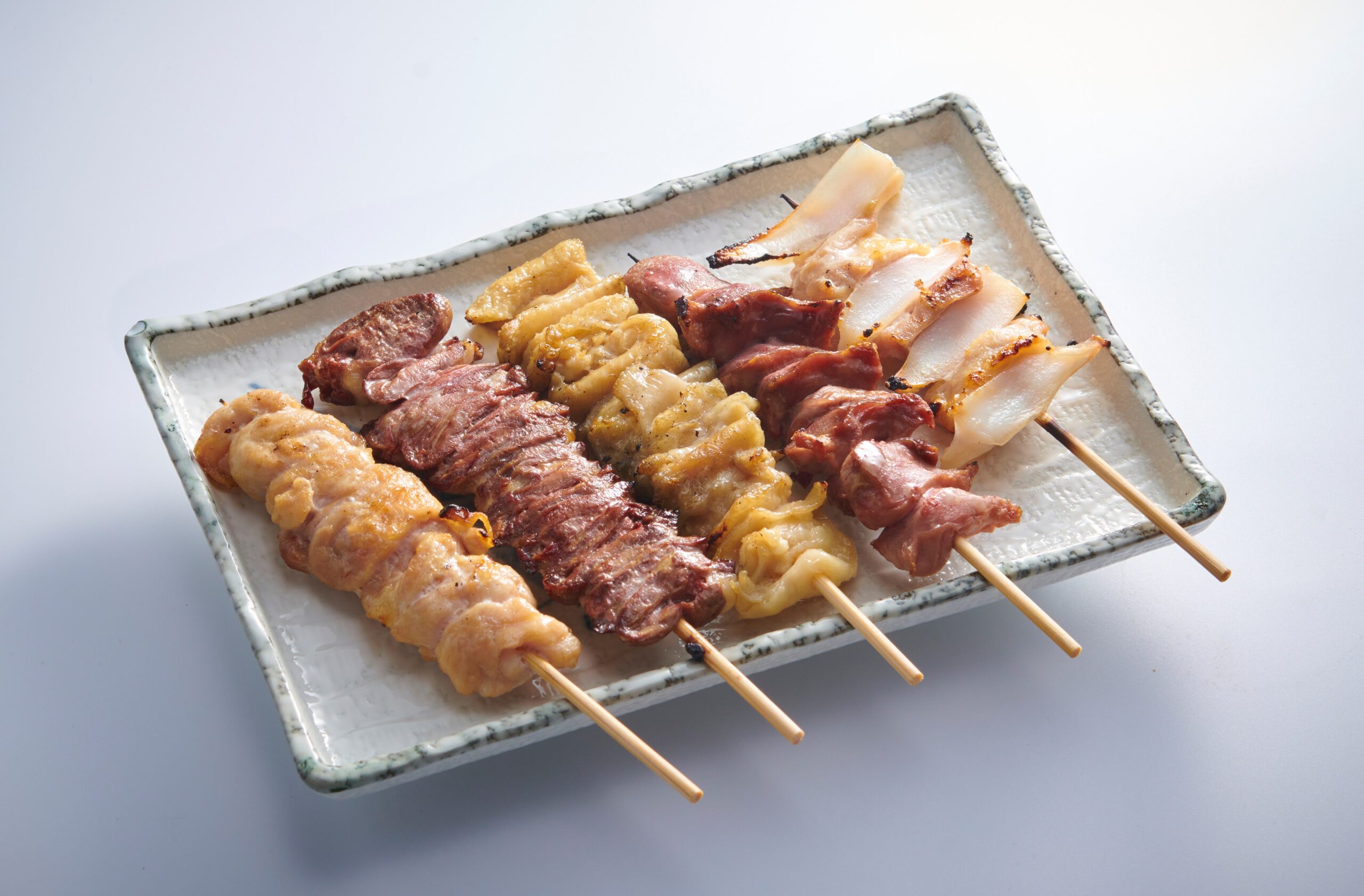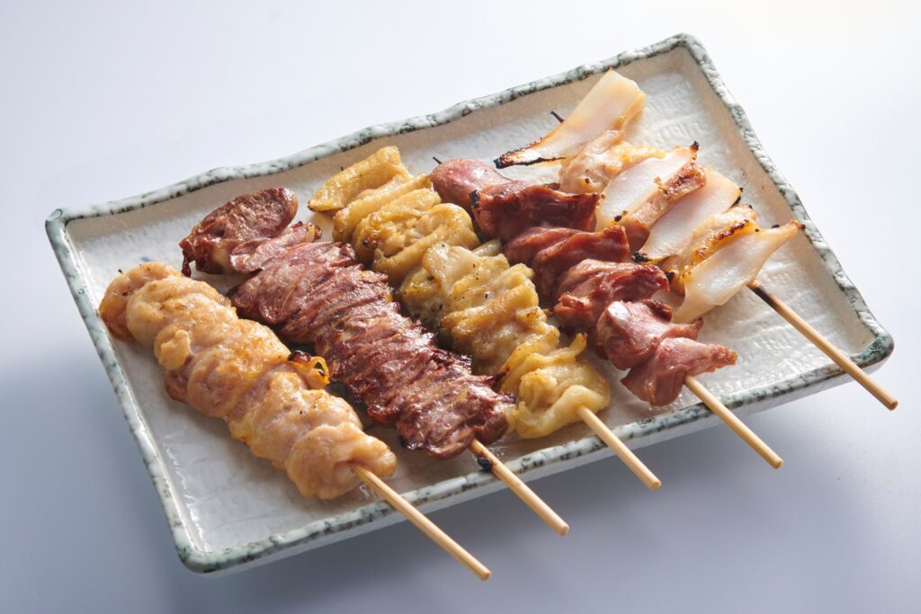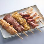新鮮な素材を使用した串焼きも美味。「串物 おまかせ5本 230B」