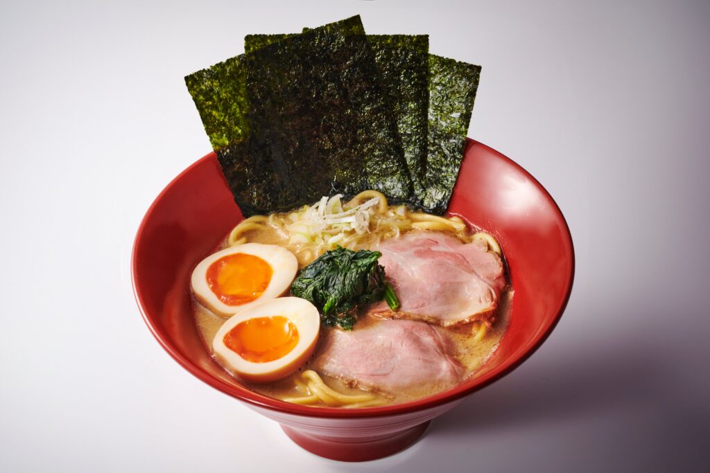 こだわりの九州醤油と “呼び戻し” 製法で作られる豚骨スープのコンビネーションが楽しめる「特製豚骨醤油ラーメン 320B」。いわゆる “家系ラーメン” だが、脂っぽさやくどさが一切なくクリアな仕上がり。噛みごたえのある太麺との相性も抜群