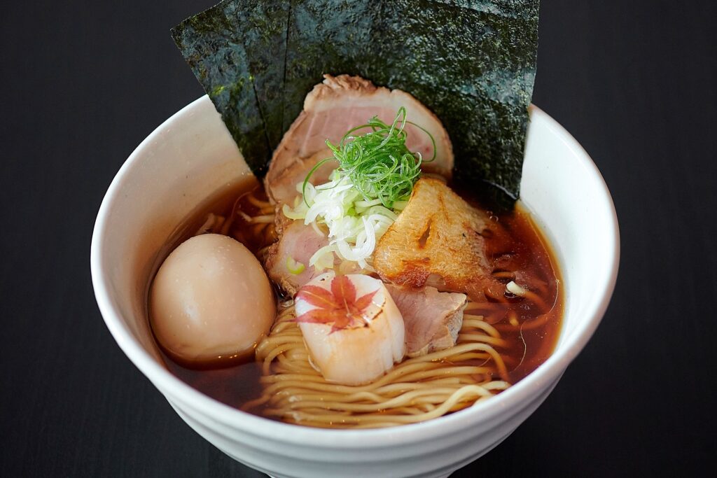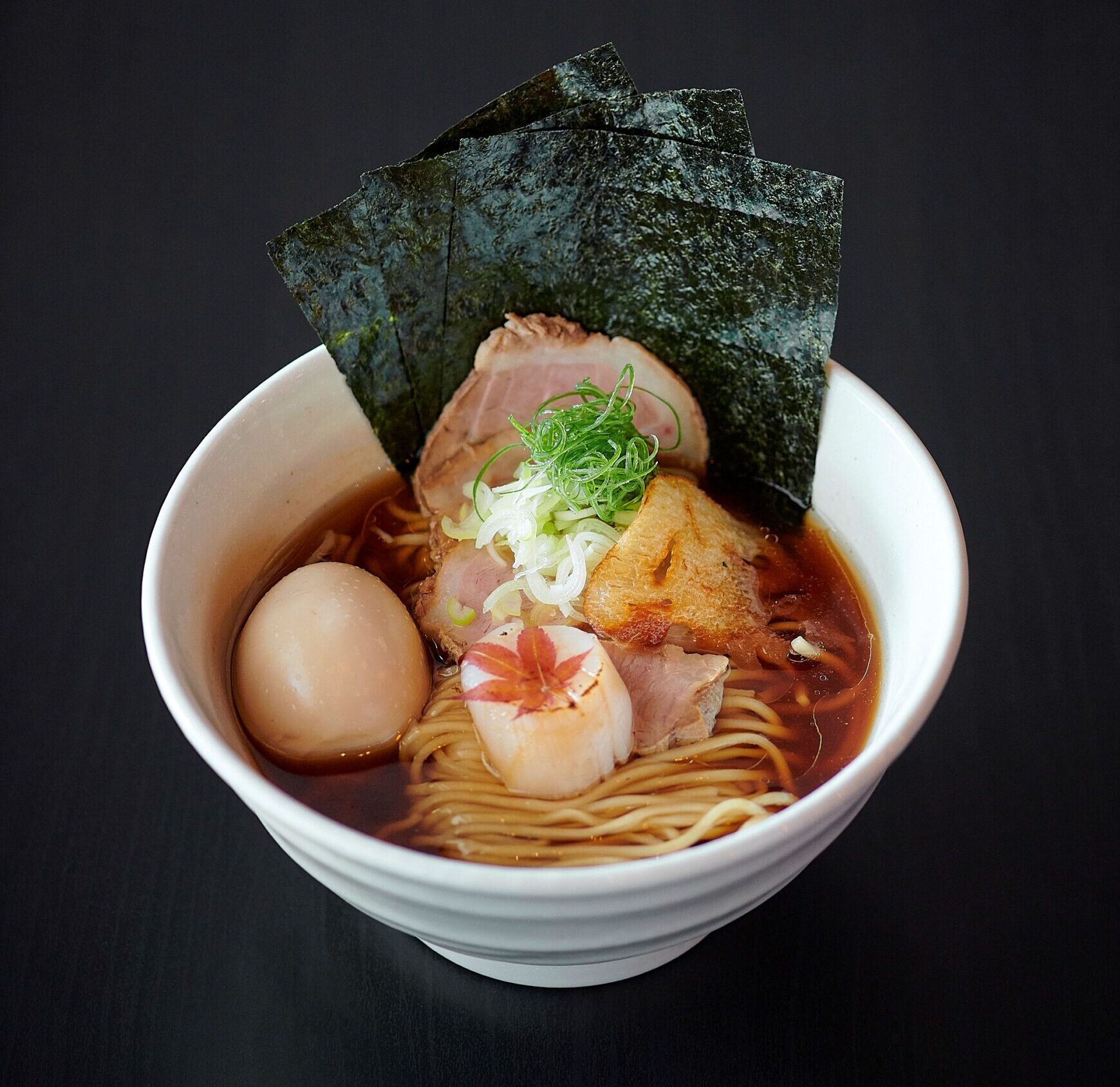 同店のシグネチャーは、香り高い醤油ラーメン。日本には多くの醤油の種類があるが、中でも博多出身の池上氏が25歳で独立した当初から珍重してきた九州の醤油蔵のものを厳選し使用。一般的な醤油は塩気が強いが、この醤油は深みのある甘さが特徴。香り引き立つ透明感のあるスープは夢中で最後の一滴まで飲み干せる。もちもちとした弾力と程よい縮れが特徴の麺とスープの絡みも絶妙だ。「香味醤油ラーメン・スペシャル 360B」