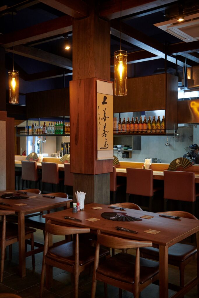落ち着きのある照明と広々とした空間でゆったり寛げる店内。駐車場も無料で利用可能