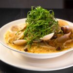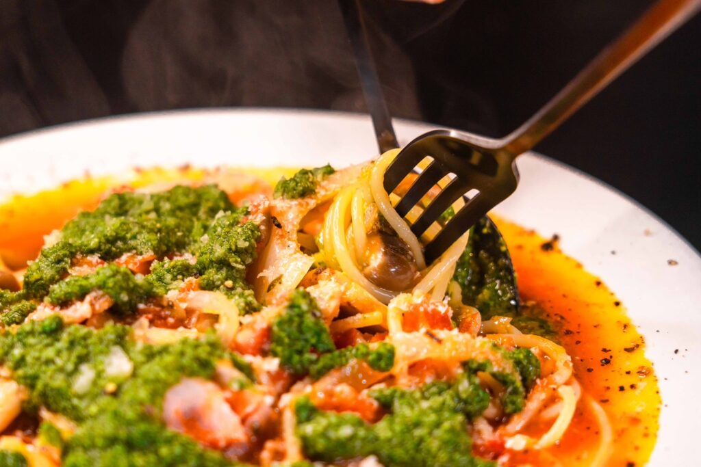 スープカレーで有名なトンロー横丁の姉妹店。和の旨味が効いたスープパスタは、出汁の香りとコクが広がる人気の一品。昼夜で異なる雰囲気が楽しめ、夜はピザやアヒージョなどクラフトビールに合うメニューも充実。掘りごたつ席やベビーチェア完備。