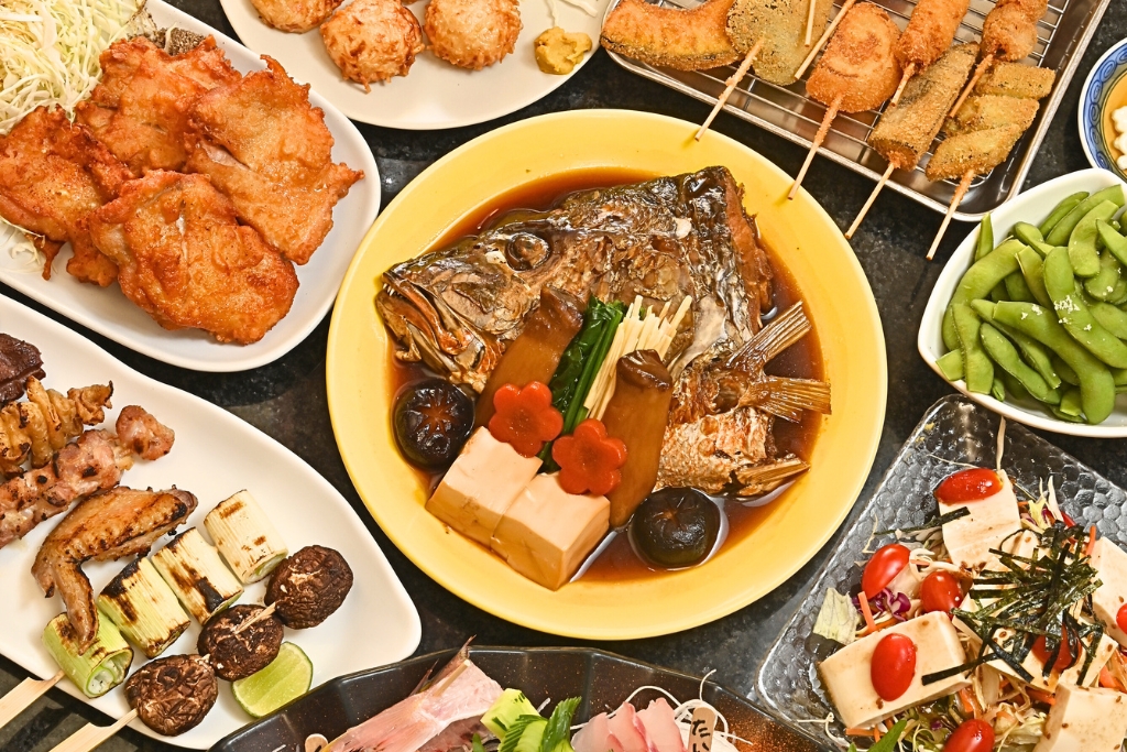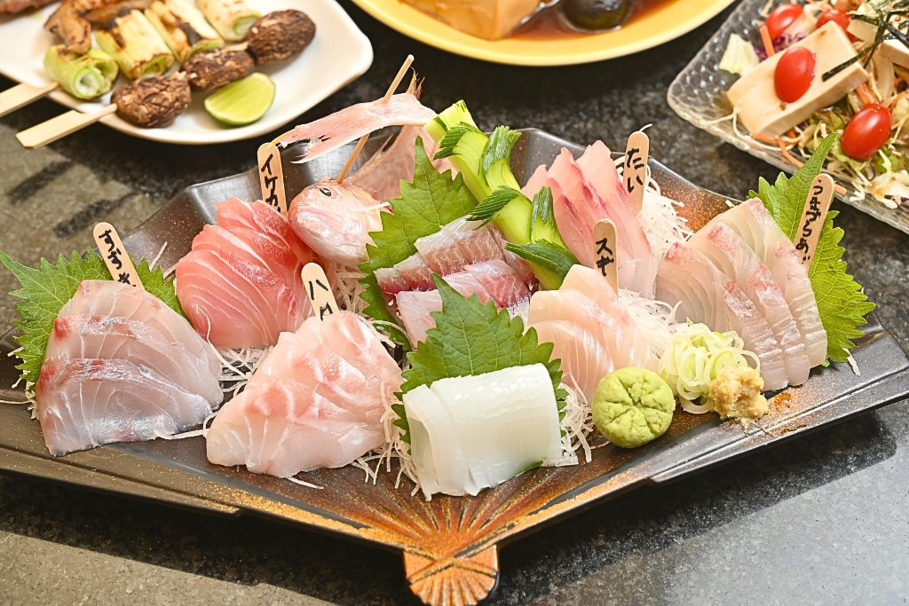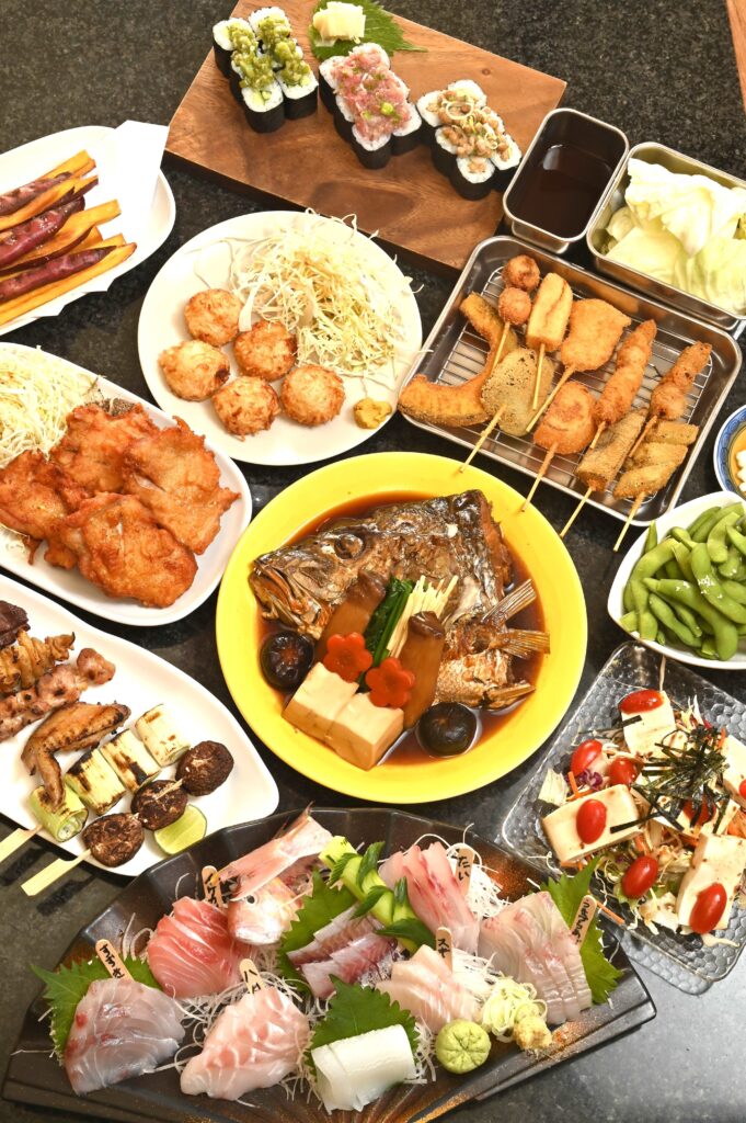 ・刺身近海盛り ・サーモン兜(or 鯛カブト煮) ・串カツ盛り合わせ(10本) ・焼き鳥盛り(7本) ・豆腐サラダ ・枝豆 ・鶏唐揚げ ・揚げカニシュウマイ ・さつまいもスティック ・ネギトロ巻き ・納豆巻き ・かっぱ茎わさび巻き