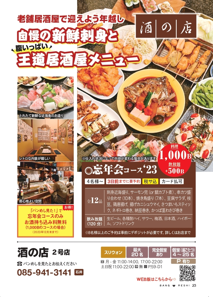 生ビール、各種酎ハイ、サワー、梅酒、日本酒、ハイボール、ソフトドリンク最低人数 |4名様より 最大人数 |25名様まで カード払 |可 予約 |3日前までに要予約 消費税 |込 サービス料|込 喫煙 |不可