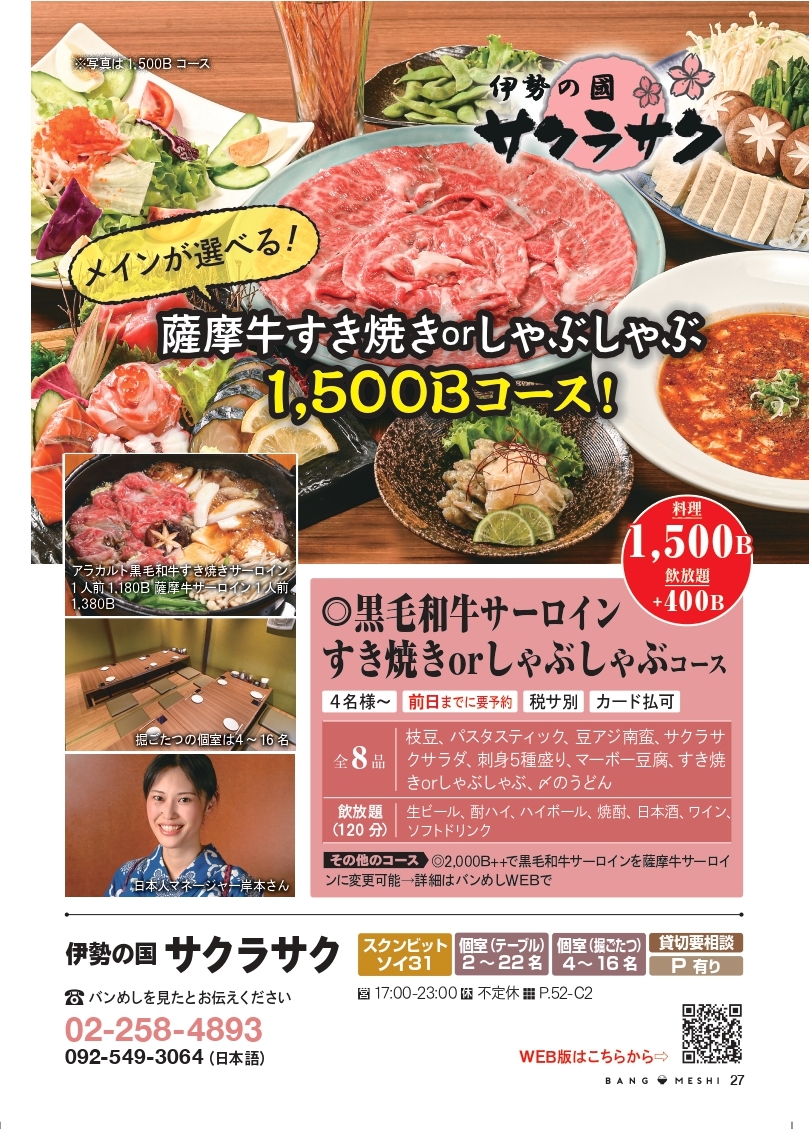 ・枝豆 ・パスタスティック ・豆アジ南蛮 ・サクラサクサラダ ・刺身5種盛り ・マーボー豆腐 ・黒毛和牛サーロインすき焼きorしゃぶしゃぶ ・〆のうどん ※+500バーツで薩摩牛サーロインに変更可能