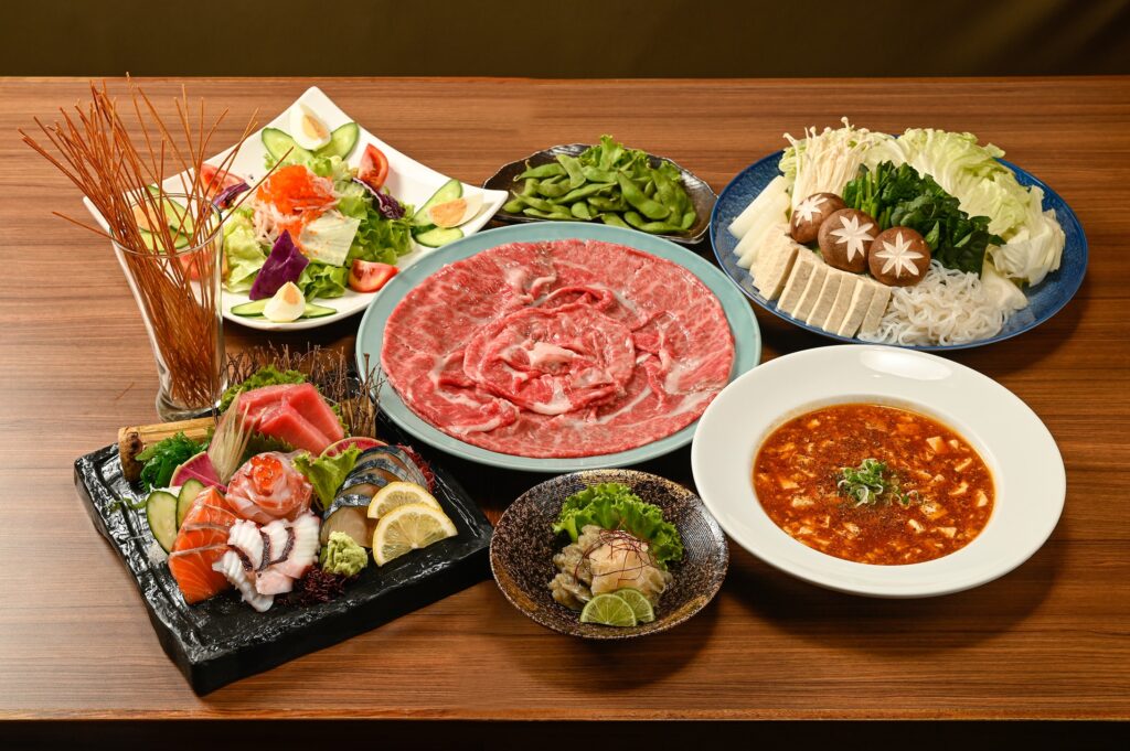 ・枝豆 ・パスタスティック ・豆アジ南蛮 ・サクラサクサラダ ・刺身5種盛り ・マーボー豆腐 ・すき焼きorしゃぶしゃぶ ・〆のうどん