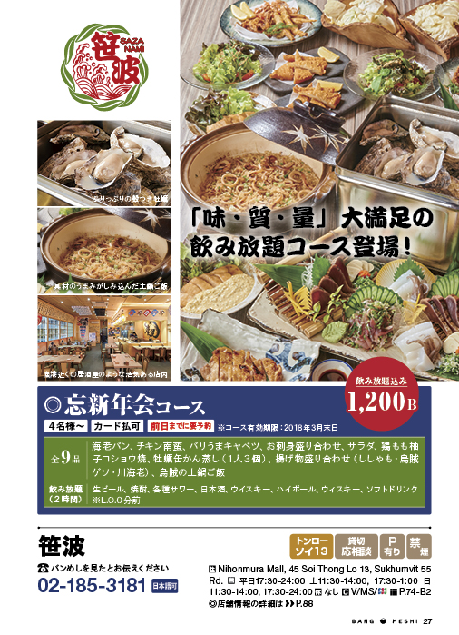 笹波(閉店)の基本情報 店舗名笹波(閉店) カテゴリ居酒屋 地域トンロー地区 お一人様予算 THB 〜 住所Nihonmura Mall, 45 Soi Thong Lo 13, Sukhumvit 55 Rd. 電話番号閉店しました 営業時間平日 17:30-24:00, 土11:30-14:00, 17:30-1:00, 日11:30-14:00, 17:30-24:00 定休日なし クレジットカードVISA/MASTER/JCB 座席数 個室情報 税金 サービス料 お通し代 ウェブサイト 地図