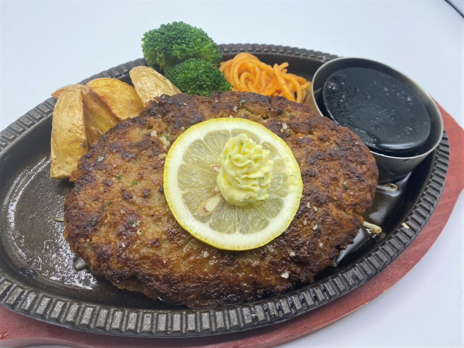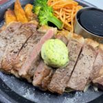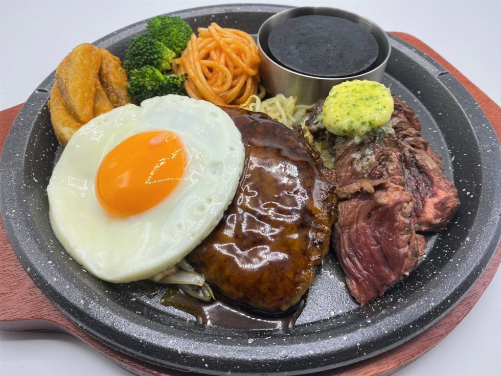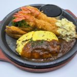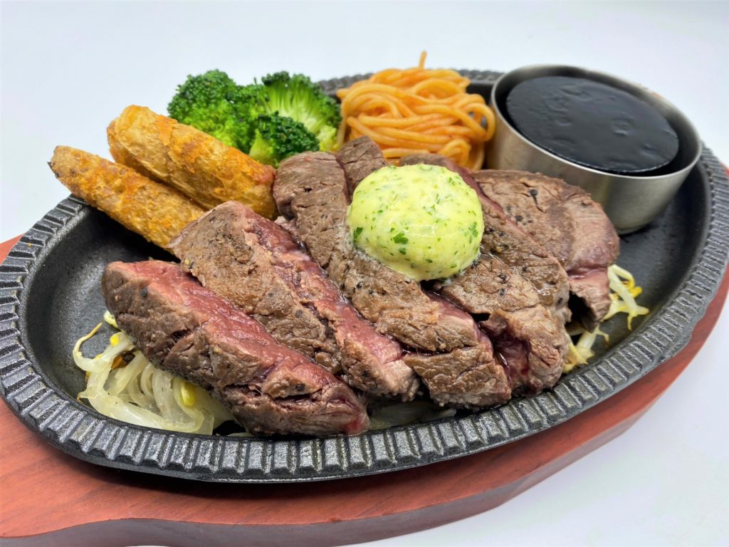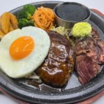 ステーキハンバーグ平嶋のこだわりとしてまず触れておきたいのは、やはり厳選肉を使用したステーキメニューだ。看板メニューの一つ「平嶋ハラミステーキ150g」(455B)は、オージー・ビーフのハラミを柔らかくジューシーに焼き上げた一皿。大満足のボリューム感と食べやすさの両立がうれしい。店内のスパイスBarスペースに揃うソースやスパイスで味変も可能。自分好みにご堪能あれ。