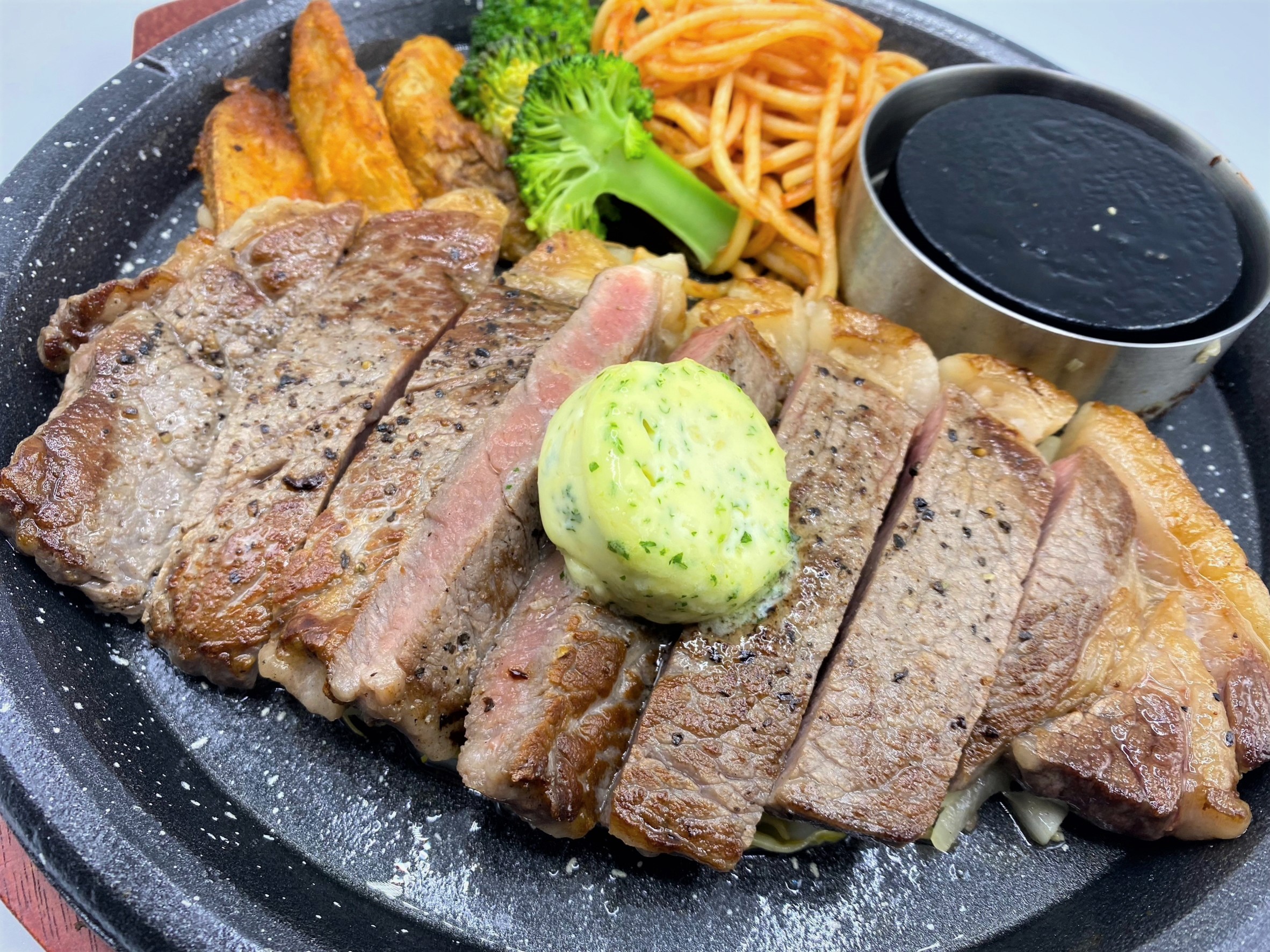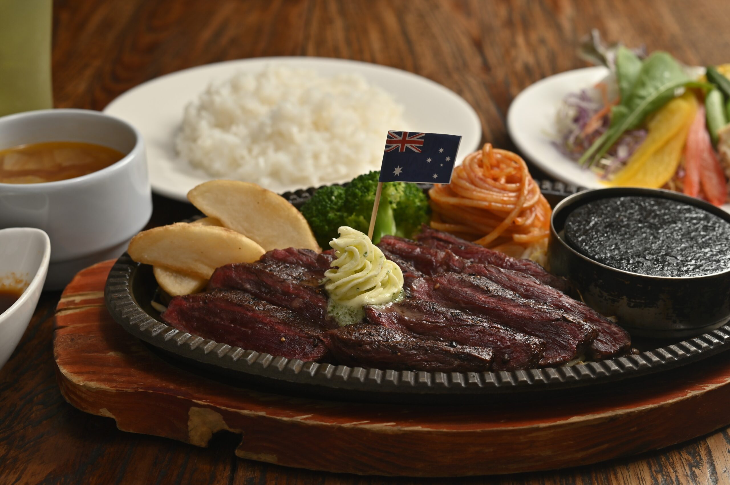 ステーキハンバーグ平嶋の絶品メニューを最も手頃に楽しめるのは、平日限定のランチメニューではないだろうか。オープン当初からの人気メニュー「平嶋ハンバーグ150g」は、おかわり自由のライス、スープ、サラダバーが付いて249B。ハンバーグに合わせる特製の和風にんにく醤油が、食べ進める手をさらに加速させる。シェフ考案の「選べるパスタ」もスープとサラダバーが付いて249Bと同じく破格。パスタは「自家製ボロネーゼとほうれん草のパスタ」と「きのこを楽しむ濃厚クリームパスタ」、「平嶋風ボンゴレビアンゴ」の3種類から選択。どれもステーキやハンバーグにも引けを取らないクオリティで、一つを選び難いほどである。