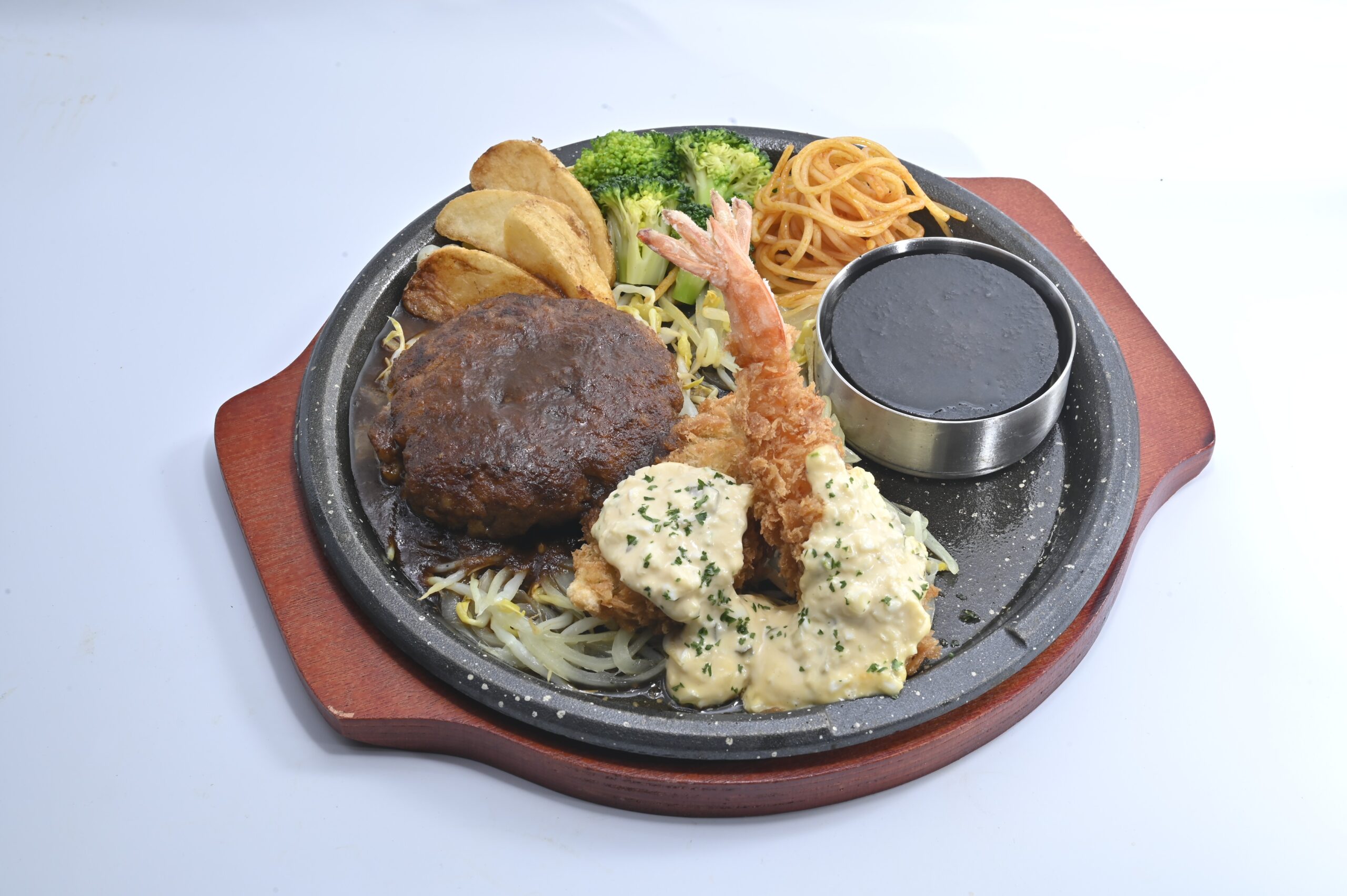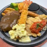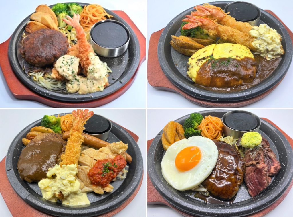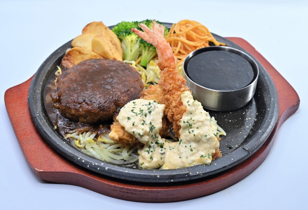 肉とフライを同時に楽しめるコンボメニュー(350B)は、洋食欲をしっかりと満たしてくれる。和食メニューを含む豊富な品揃え。