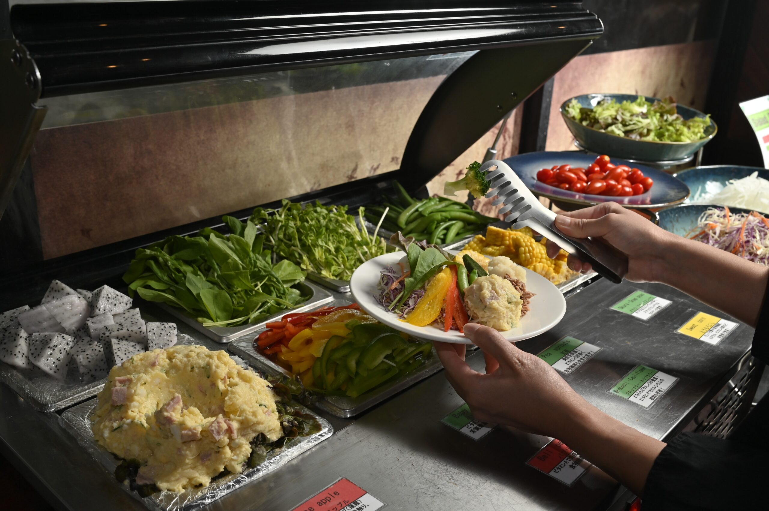 ステーキハンバーグ平嶋を訪れた際には、メイン料理に+69Bでつけられるおかわり自由のサラダバーもぜひ利用してほしい。店内奥のサラダバーには、常に数種類の新鮮な野菜が並ぶ。野菜各種の栄養価などを記したカードは、お店のさりげない気配りも伺えてありがたい限り。タイ生活が長くなると陥りがちな野菜不足にもってこいだ。