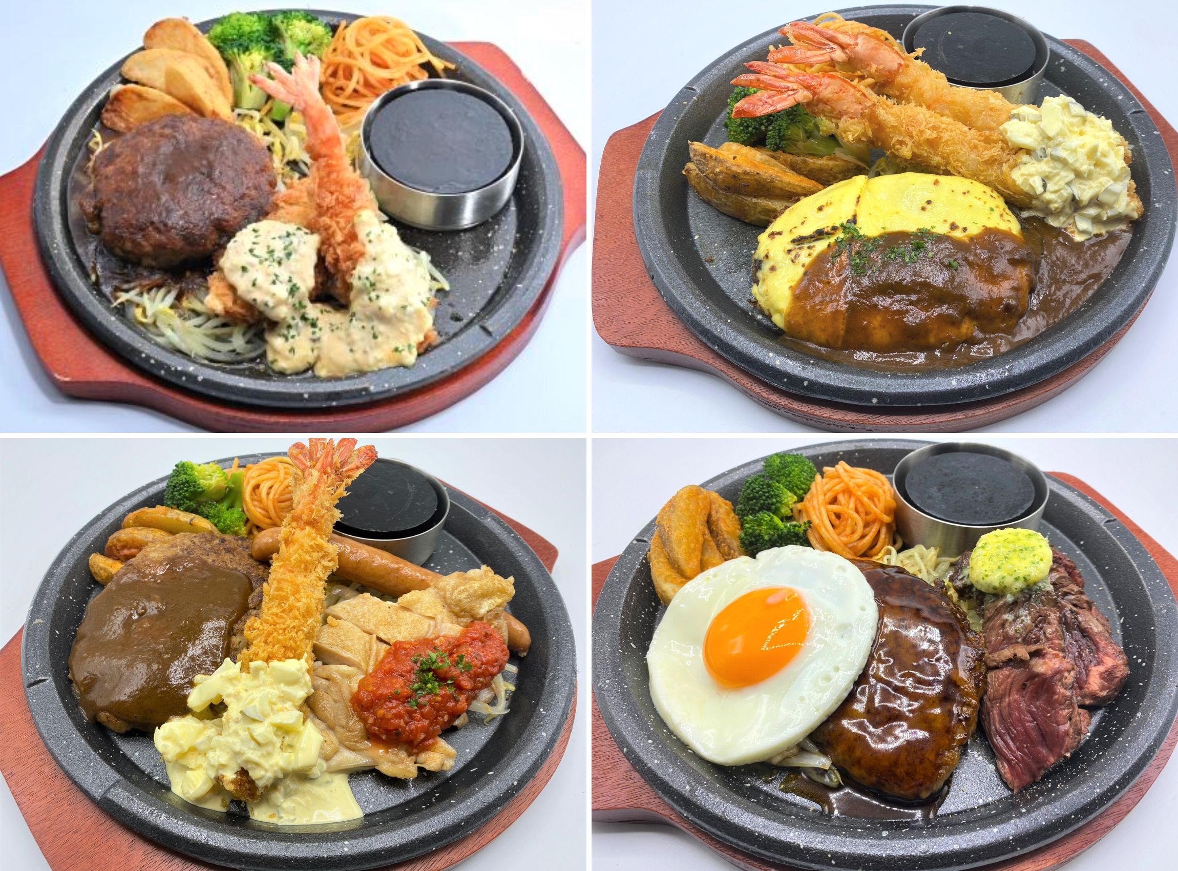 左上:「平嶋ハンバーグ150g」単品では200Bで提供可能。右上:こだわり牛肉と辛さの選べる自家製トマトソースを使用したボロネーゼ。左下:4種のきのこと自家製クリームソースがしっかりと絡まり合うクリームパスタ。右下:ほどよい辛味とニンニクのパンチがハマグリの風味を引き立てるボンゴレ。