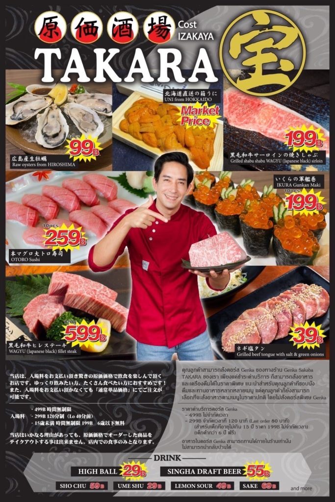 原価酒場 宝の基本情報 店舗名原価酒場 宝 カテゴリ居酒屋 地域トンロー地区 お一人様予算500 THB 〜 住所トンロー通りソイ13向い(トンロー12と14の間) 電話番号06-5984-8550(16時以降) 営業時間月-木17:00-24:00, 金17:00-25:00, 土11:00-25:00, 日祝11:00-23:00 定休日不定休 クレジットカードなし 座席数 個室情報 税金 サービス料 お通し代 ウェブサイト 地図 関連店舗一覧 トンロー 居酒屋 隠れ家 離れ(トンロー) プロンポン南 居酒屋 隠れ家 雫(スクンビット24) トンロー 居酒屋 旬魚菜肉肴酒 L'ecrin55 関連記事 2022.03.4 今夜の逸軒 卸し価格で食べられる!隠れ家プロデュースの店