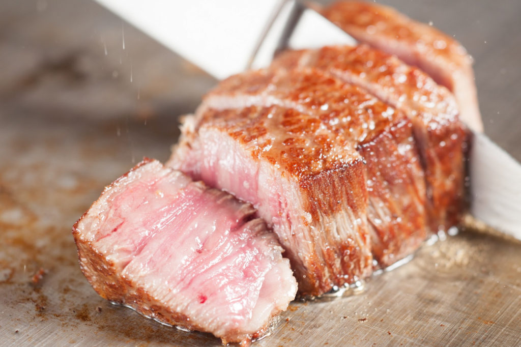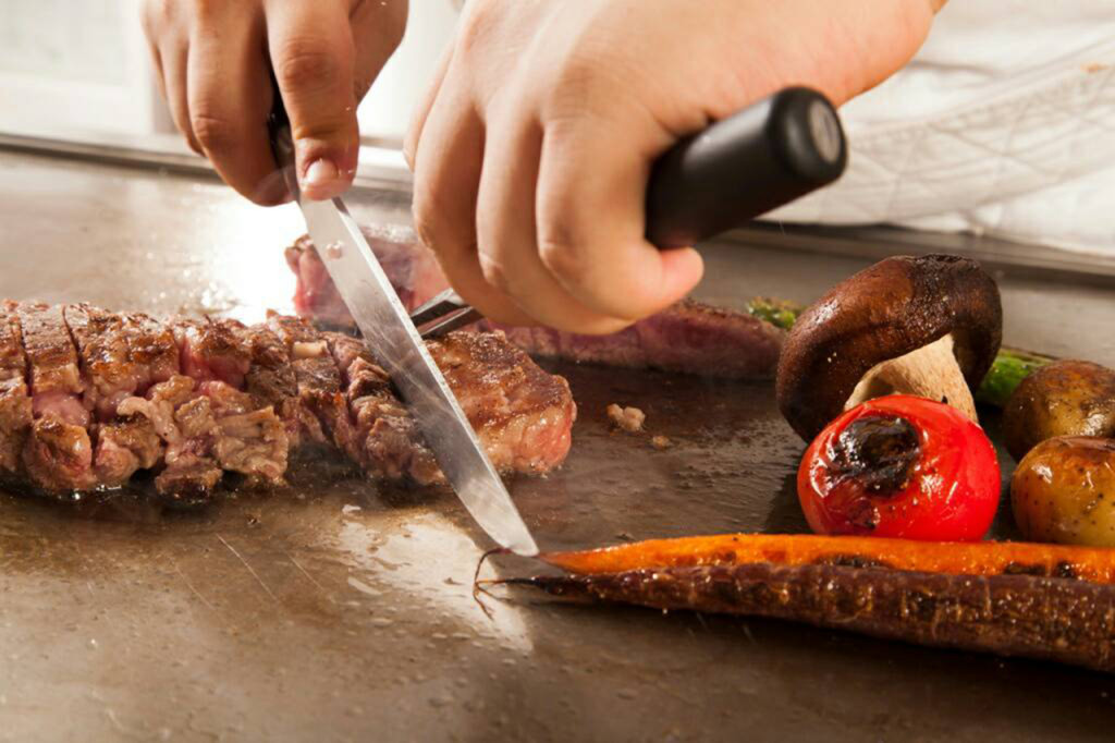 料理の道25年の橘シェフが豪快なヘラ捌きで焼き上げるステーキは、表面をカリっと焼き付けるのが大きなポイント。