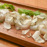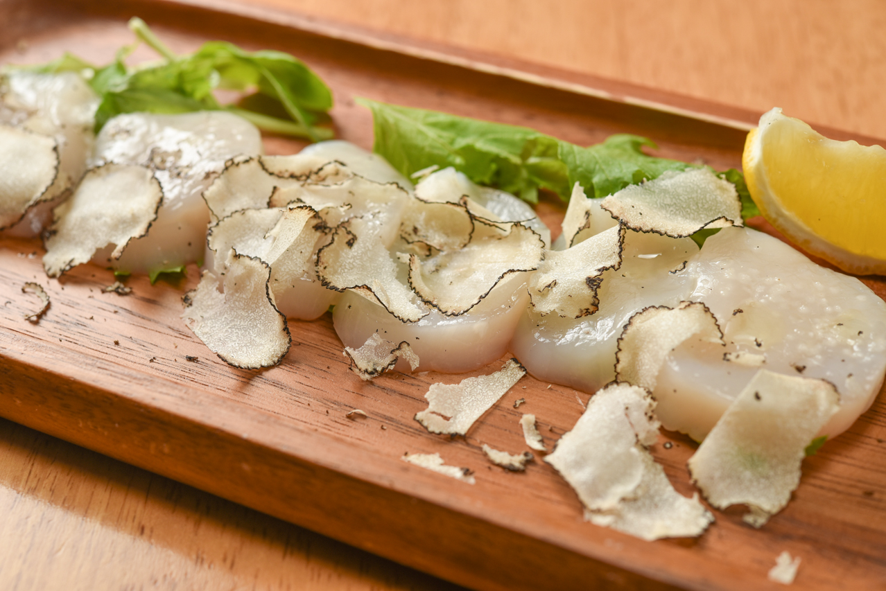 日本から直送される肉厚の帆立にトリュフをたっぷり削り掛けた帆立カルパッチョ(690B)