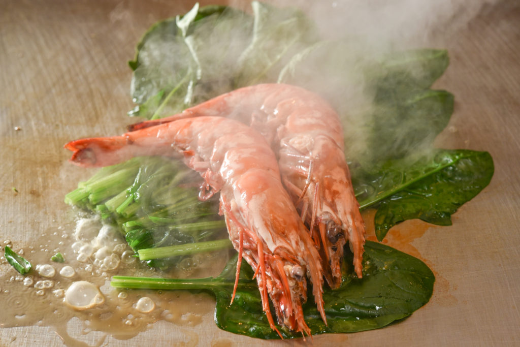 ミネラル分たっぷりのピンクソルトとガーリックバターでシンプルに仕上げることで、新鮮なブラックタイガーならではの甘みがさらに際立つ。