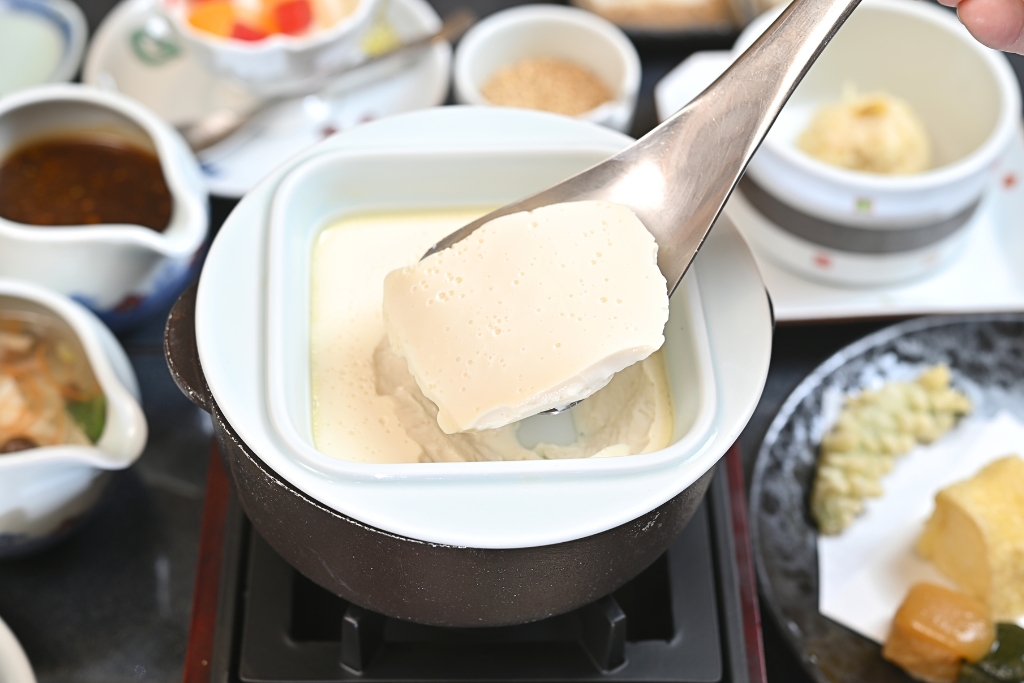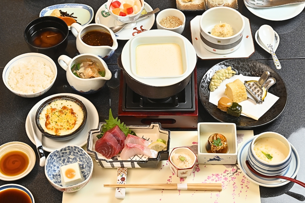 ・小鉢三種 ・茶碗蒸し ・お造り ・名物 とうふしゅうまい ・ふく福豆富 麻婆あん 湯葉野菜あん ・生麩田楽 ・湯葉揚げ ・湯葉グラタン ・湯葉味噌汁(湯葉吸物) ・香の物 ・飯物 ・デザート