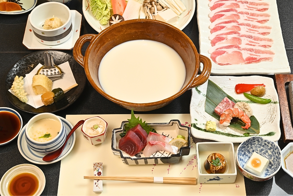 ・小鉢三種 ・お造り ・名物とうふしゅうまい ・豚と野菜の豆乳しゃぶしゃぶ ・黒毛和牛と海鮮の溶岩焼き ・湯葉揚げ ・生麩田楽 ・豆乳リゾット ・香の物 ・デザート
