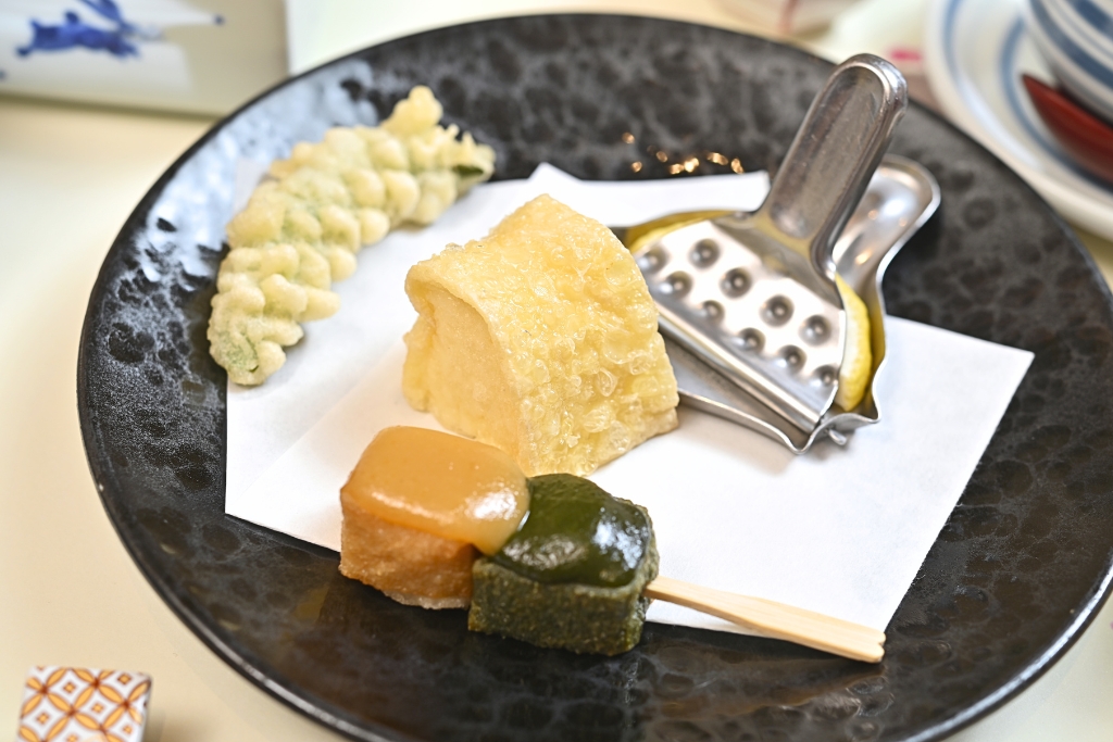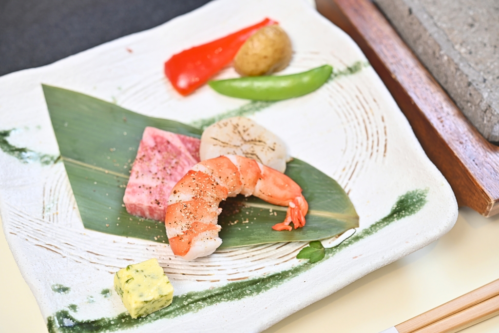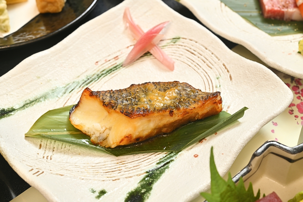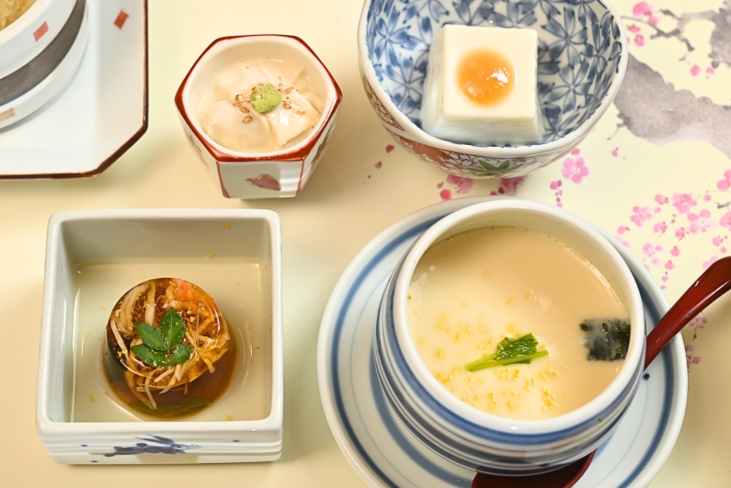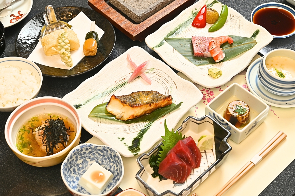 ・小鉢三種 ・茶碗蒸し ・お造り ・揚げ出し豆腐 ・湯葉揚げ ・生麩田楽 ・黒毛和牛と海鮮の溶岩焼き ・銀鱈塩焼き又は銀鱈西京焼き ・湯葉味噌汁 ・飯物 ・香の物 ・デザート