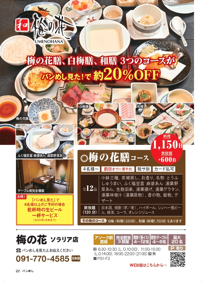 日本酒、焼酎(芋/麦)、ハイボール、シンハー瓶ビール、緑茶、コーラ、オレンジジュース最低人数 |4名様より 最大人数 |20名様まで カード払 |可 予約 |前日までに要予約 消費税 |別 サービス料|別 喫煙 |不可
