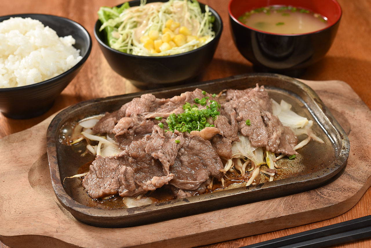 定食の人気メニュー、焼肉プレート定食(240B)。ランチは11時~16時まで、ごはんおかわり大盛り無料!