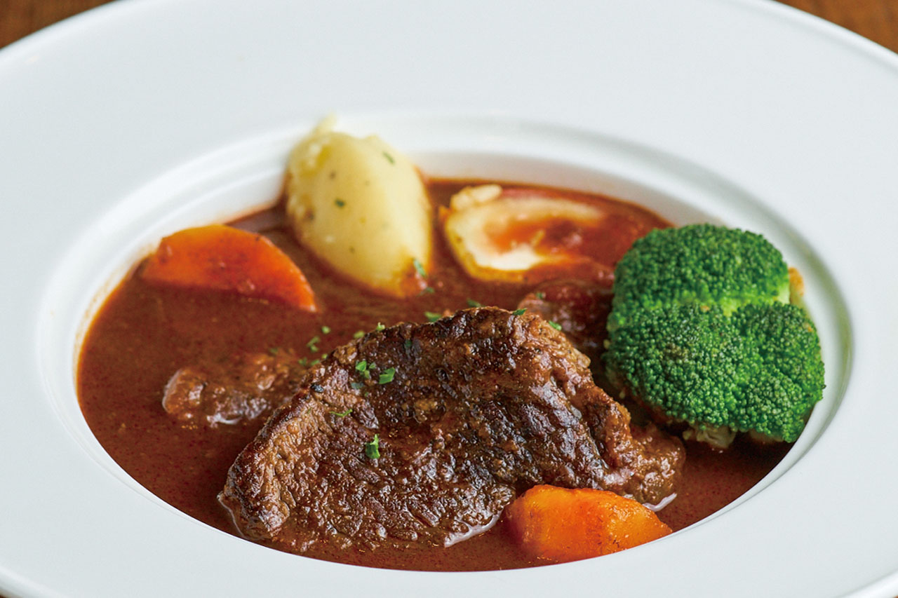 オーダーに迷ったら「ダブルステーキ」(300g/890B)がおススメ。2種類の部位をリーズナブルに楽しめて(部位はお任せ)ボリュームたっぷり!じっくり煮込んだ「ハッシュドビーフ」、ベルギーの郷土料理「ビール煮込み」など、季節のメニューもお目見えしている。