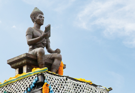タイの歴史の骨格を成しているのは4つの王朝です。最初がスコータイ王朝(1238年~)、次にアユタヤ王朝(1351年~)、トンブリー王朝(1767年~)、4番目が現在も続くチャックリー王朝(1782年~)です。現在のタイの基盤が作られたのはスコータイ王朝時代で、ラームカムヘーン大王は今でも国民に尊敬されています。「教育の父」とも呼ばれる大王は、今から約700年前の1283年にクメール文字を元にタイ文字を考案したと考えられています。