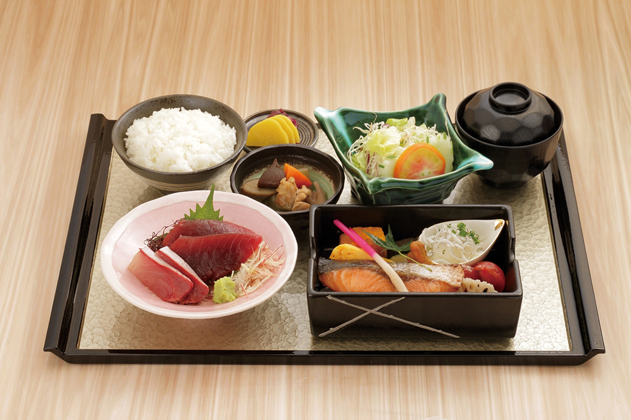 刺身と焼魚御膳(450B)ほか、毎日楽しめるランチメニューは約30種類。サーモン幽庵焼き、銀鱈西京焼きなど手間ひまかけた定食が290Bから