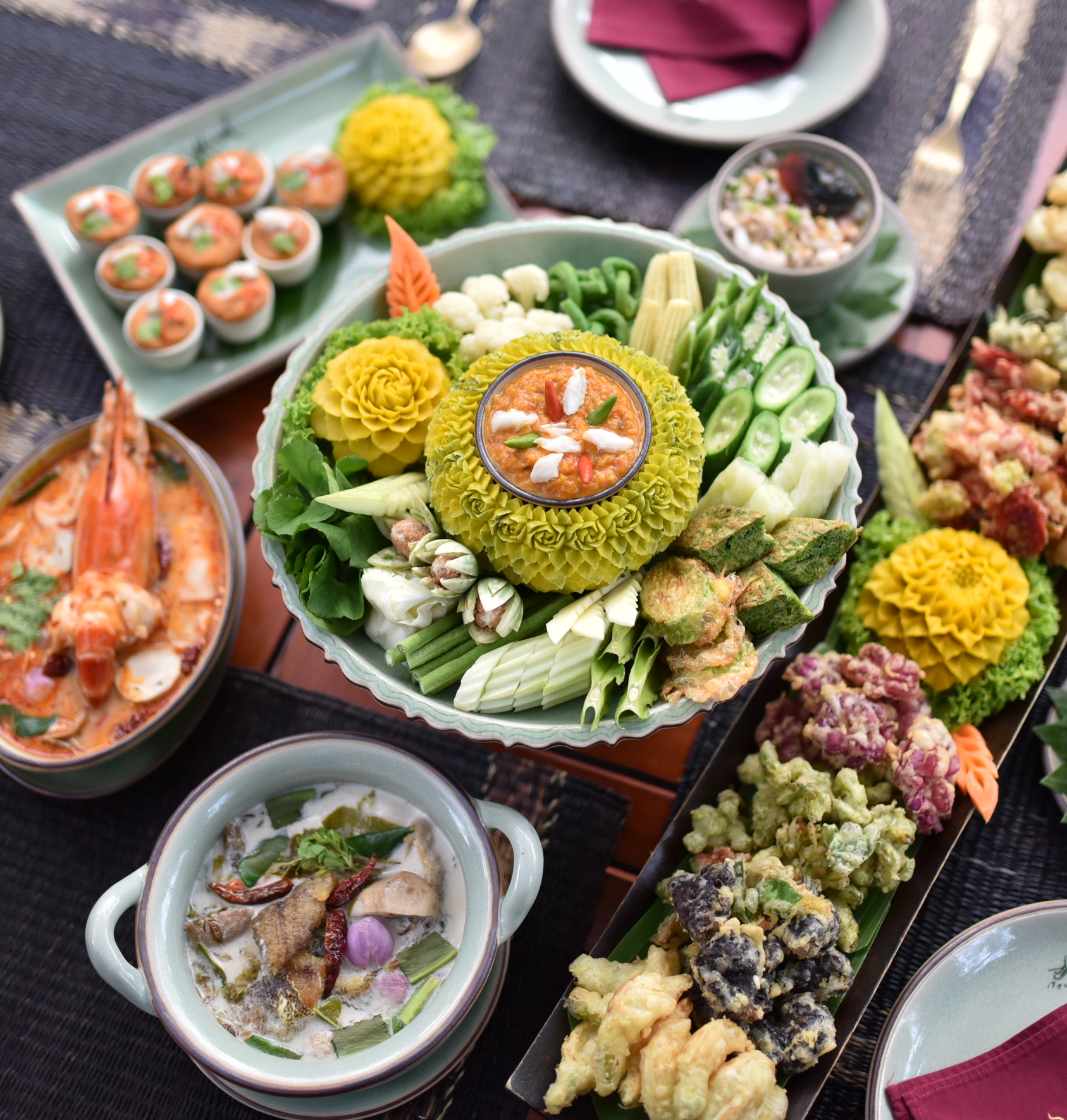 ラマ2世時代の贅沢な邸宅をそのまま解放しています。8種類の花をクリスピーに揚げた「Chun-Cheu Boos-Sa-Ba」や「タイ風茶碗蒸し」が人気です。自家農園の野菜や果物を使用。