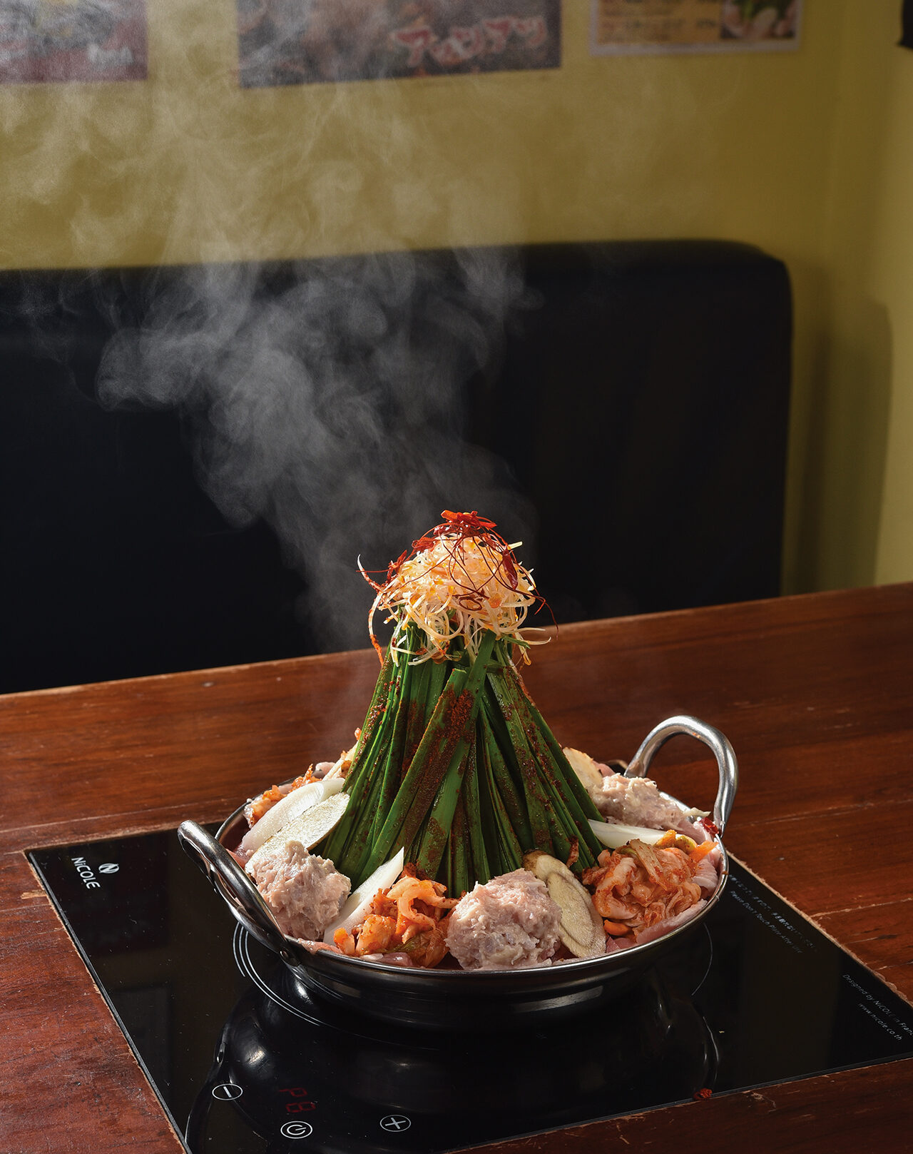 日本に20店舗を構える博多の大衆居酒屋「九太郎」。多彩な九州料理の中でも、やはり外せないのがもつ鍋だろう。今回紹介したいのは、博多の旨い!を詰め込んだ、明太子高菜もつ鍋。日本から仕入れた2種類の特製醤油をブレンドして作るスープに、下処理に時間をかけるこだわりの牛もつを使用。丁寧に磨き上げることで臭みを抑え、旨味を前面に押し出している。スープに溶け込むもつの甘み、そして明太子と高菜の風味が調和した味わいは、まさに博多の真髄だ。