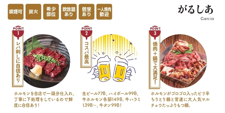 カウンターで1人から貸切で16名まで楽しめるコスパ最高の店。自慢のホルモンは一頭分を独自のルートで仕入れ、お店で丁寧に下処理。鮮度抜群のホルモンを全品149Bのお値打ち価格で提供する。